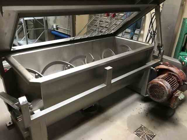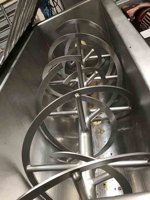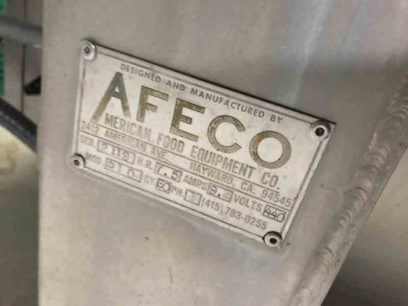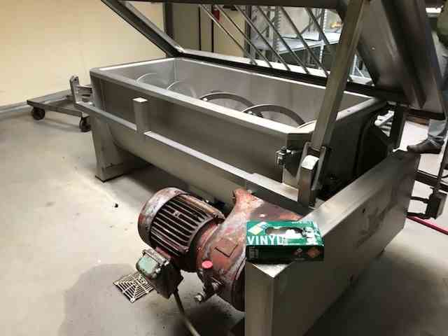 Used Stainless steel ribbon mixer, approximately 18 cubic feet capacity, manufactured by AFECO, Model number 510, driven by 7.5 HP motor, rated for 440 volt, 3/60Hz. Double ribbon design and includes center bottom discharge. Drive is gear drive through v-belt or chain & sprocket assembly. Serial Number 2119. Last used in food process. Good condition.