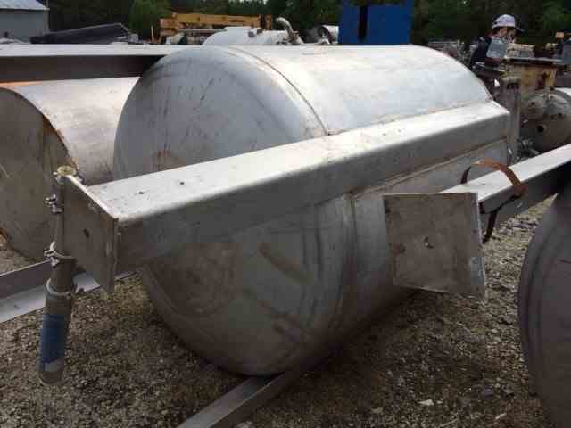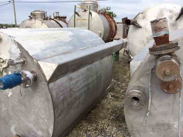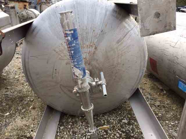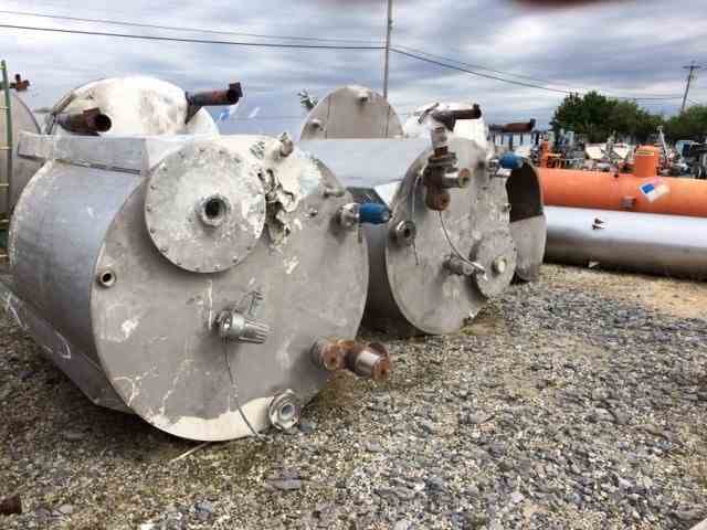 Used approximately 800 gallon T316 stainless steel vertical tank. Approximately 60" diameter X 64" straight side. Flat welded top. Dished bottom. Top 18" manway. (2) 2" flanged (1) 3" flanged, (2) 1-3/4" and (1) 2" sanitary type connection. 1/2" threaded top fitting. Approximately 3" center bottom outlet. 18" top manway. 4 legs providing 24" clearance. (Qty - 2 available)