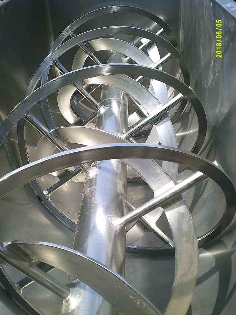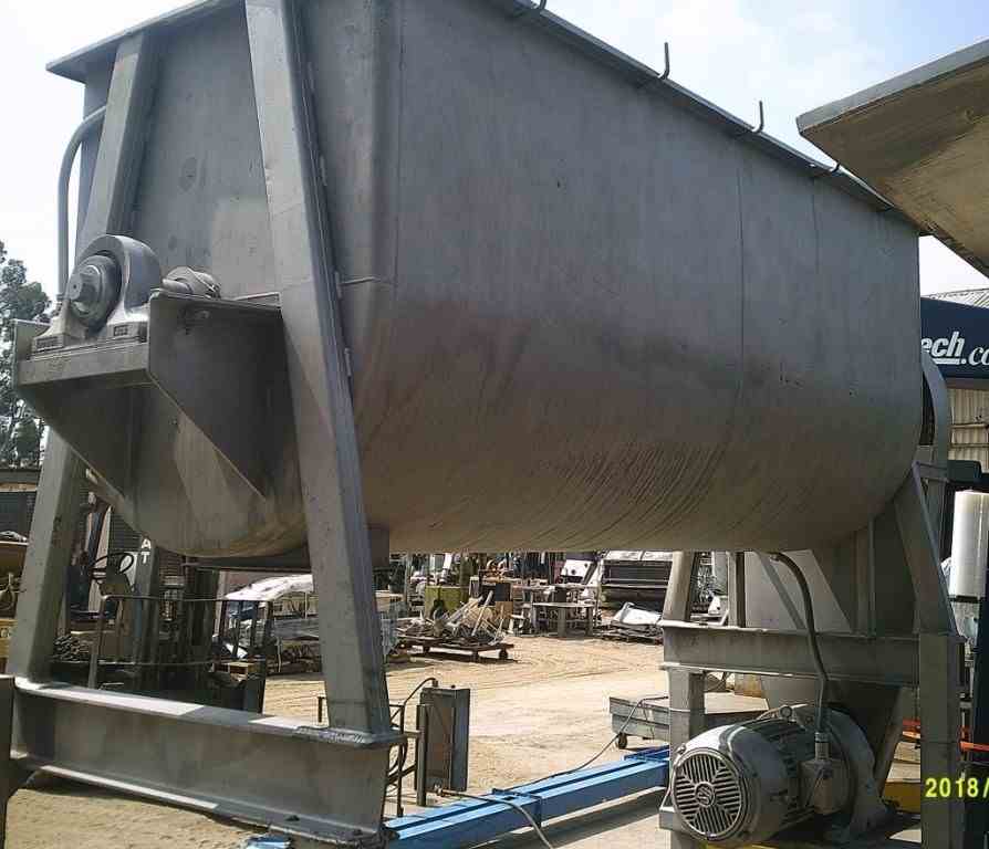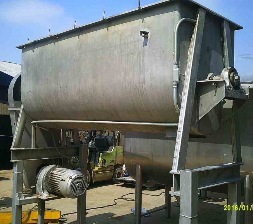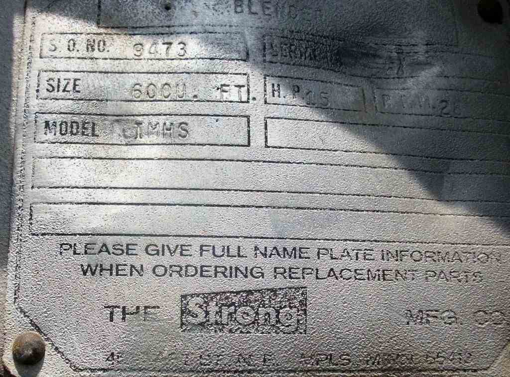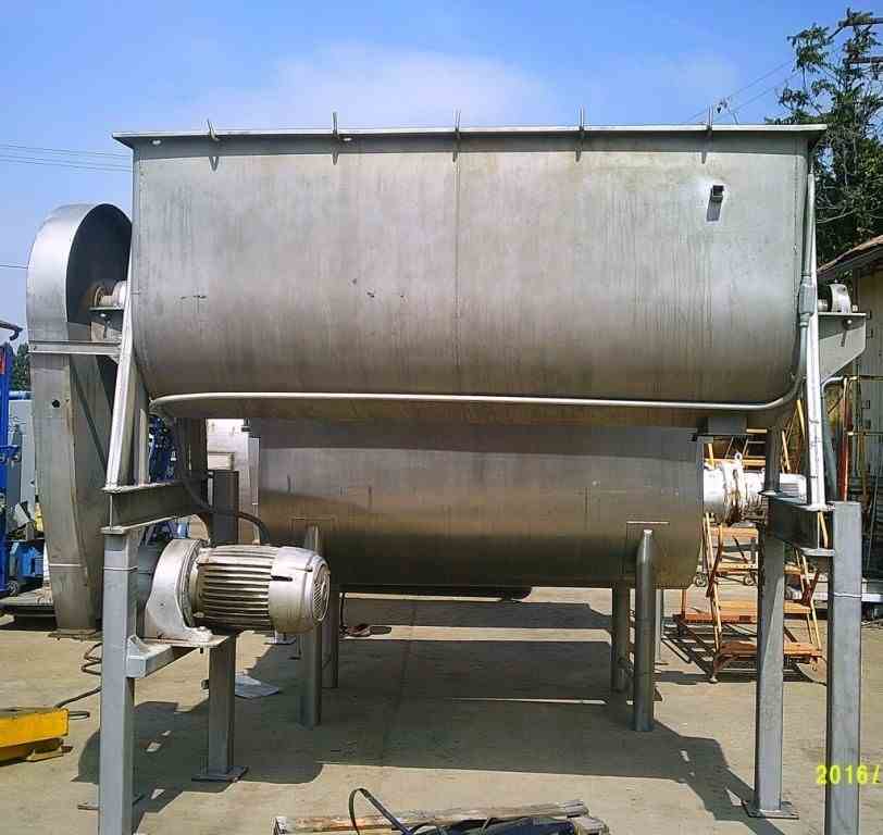 Used Strong Scott 60 Cu. Ft. stainless steel double ribbon mixer. Model IMHS. Trough measures 98" x 38" x 43" deep with 1.5" x 0.5" outer ribbon and 2.625" x 0.25" inner ribbon. 5.5" x 17" end bottom discharge, 64" from ground. Unit is driven by 15 HP, 208/220/440V 1800 rpm motor thru Dodge gear reducer. Serial number 2158.
