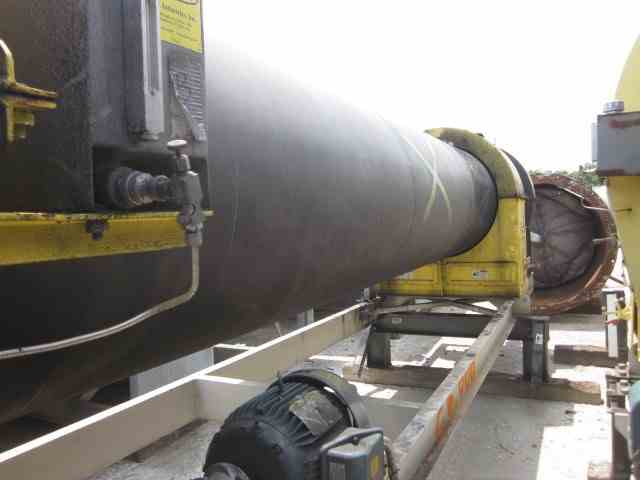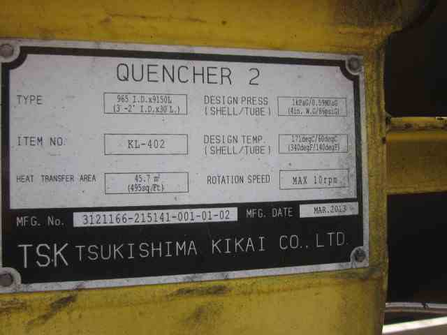 Used Rotary Water Tube Quencher. 38” W x 30’0” L. Coal flow 2,750 LB/HR. Design Pressure 4 INWG (shell) / 85 PSIG (tube). Design Temperature 340 F (shell) / 140 F (tube). Rated 10 HP Variable Speed Drive. Included L-401 Quencher 2 Inlet Screw Conveyor, Max Shell Rotation Speed 10 RPM. Shell Slope 1:100. Heat Transfer Area 495 Sq. Ft. ½” Thick Carbon Steel Shell. Outer Tubes (14) 4” Sch. 80 CS (4.5” OD x 0.337” Thick). Inner Tubes (14) 2.5” Sch. 40 CS (2.875” O.D. x 0.203” Thick).