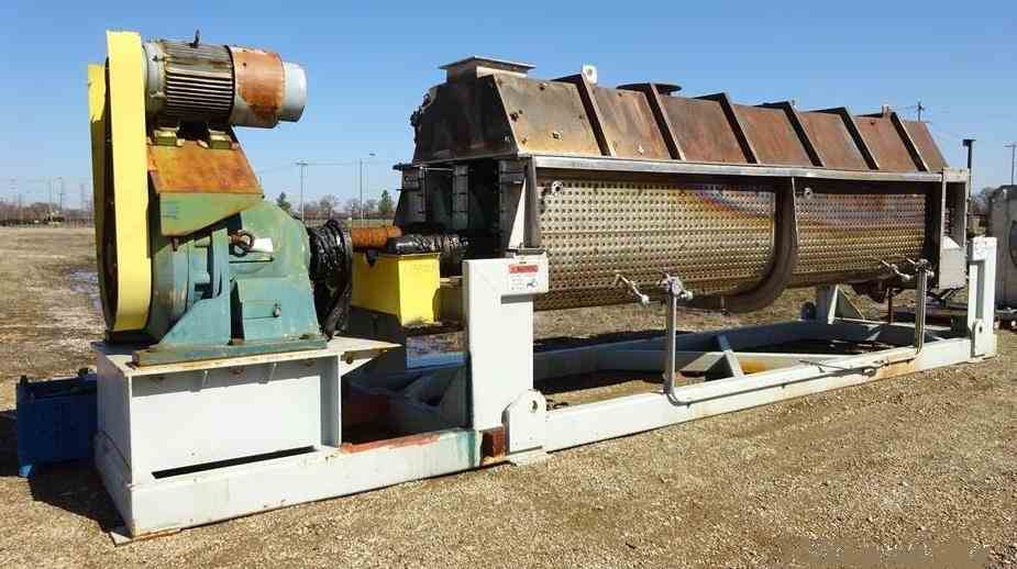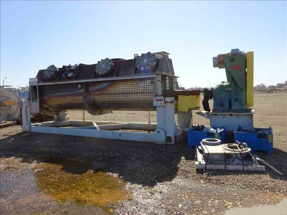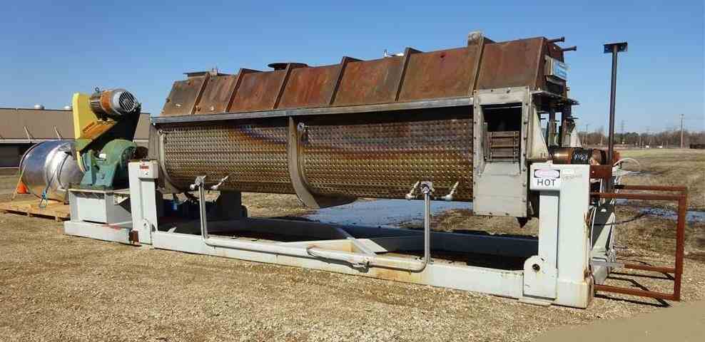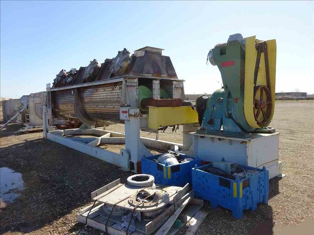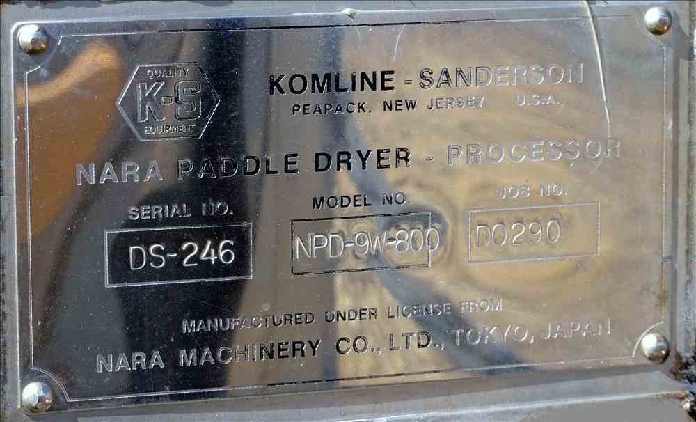 Used Komline Sanderson NARA Paddle Dryer/Processor, Model NPD-9W-800. 316L stainless steel jacketed trough approximately 228" long x 65" wide x 45" deep, 800 square feet of heat transfer area, rated 150 psi at 366 degrees F. (2) 36" Diameter x 228" long carbon steel cored screws, rated 150 psi at 366 degrees F. 48" x 13" end bottom outlet with air operated slide gate valve. Driven by a 75 HP, 3/60/230/460 volt, 1780 rpm motor thru SmCyclo 59:1 ratio. Includes a bolt down top cover with 3 manways: (1) 16", (1) 18" x 18". Mounted on a carbon steel frame.