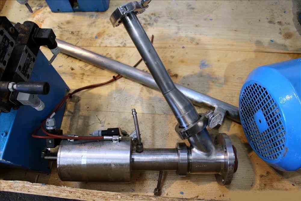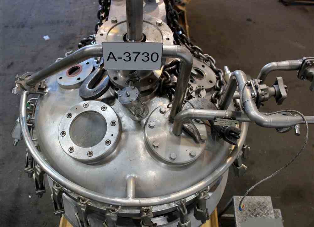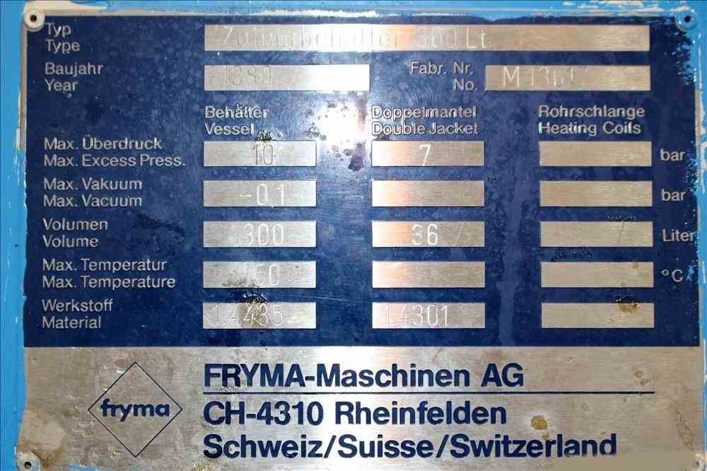 Used- Fryma Vacuum Mixer, Model 300, 316 Stainless Steel. 300 Liter working capacity. (1) Hellmich Reactor, 79 Gallon (300 Liter), 316 Stainless Steel, Vertical. Approximate 32" diameter x 24" straight side. Dished clamp on top, dished bottom. Internal rated -1/12 bar (174 psi) at 150 degrees C (302 F), 304 stainless steel jacket rated 8 bar (116 psi). Anchor agitator with bottom and side wall scrape driven by a 4kw, 3/50/380 volt, 1420 rpm gear motor. Hydraulic top lift, (3) spray balls. Openings top: (1) 6", (1) approximate 5-1/4" sight glass, (1) 5" for agitator, (2) 2", (1) 1-1/2", (3) 1" for spray balls. 2-1/2" Center bottom outlet. Mounted on a carbon steel frame. Serial# M13617. Built 1989.