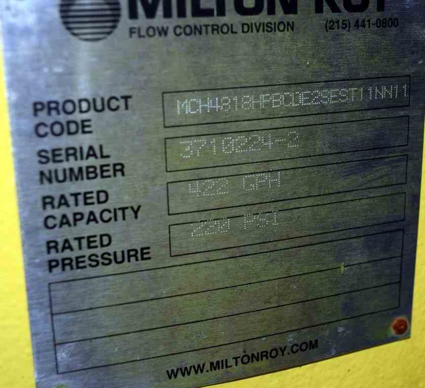 Used Milton Roy Metering Pump. Model MCH4818HPBCDE2SEST11NN11. Rated 422 gallons per hour at 220 psi. Driven by a 3hp, 3/60/460 volt, 1765 rpm motor. Serial# 3710224-2.