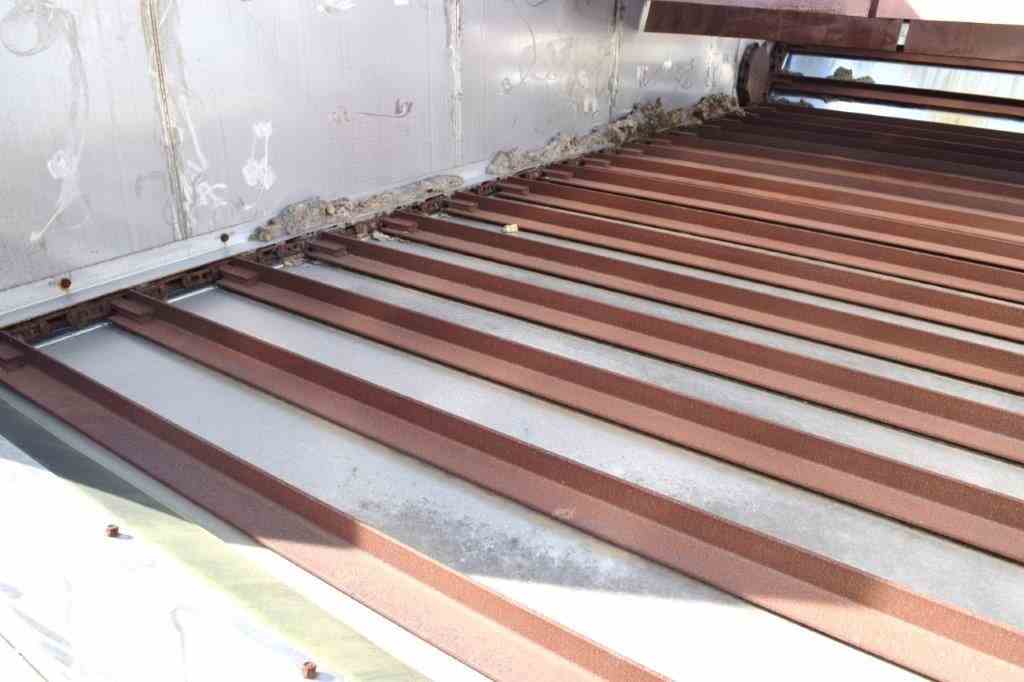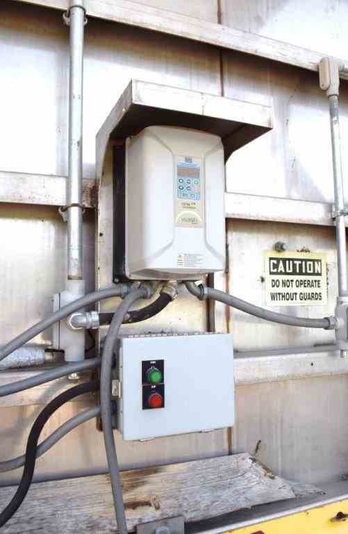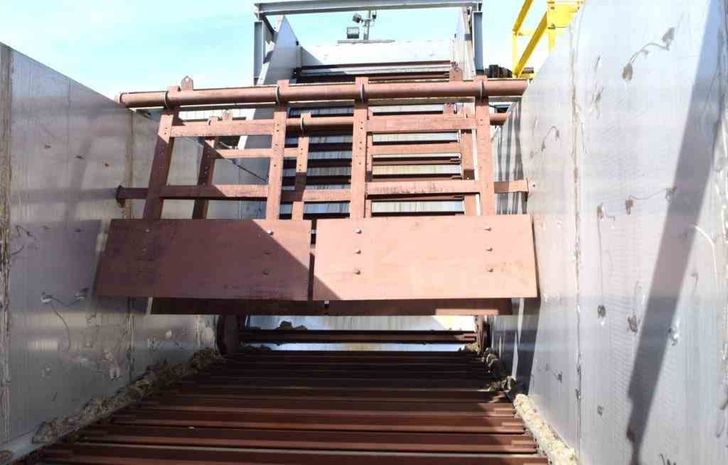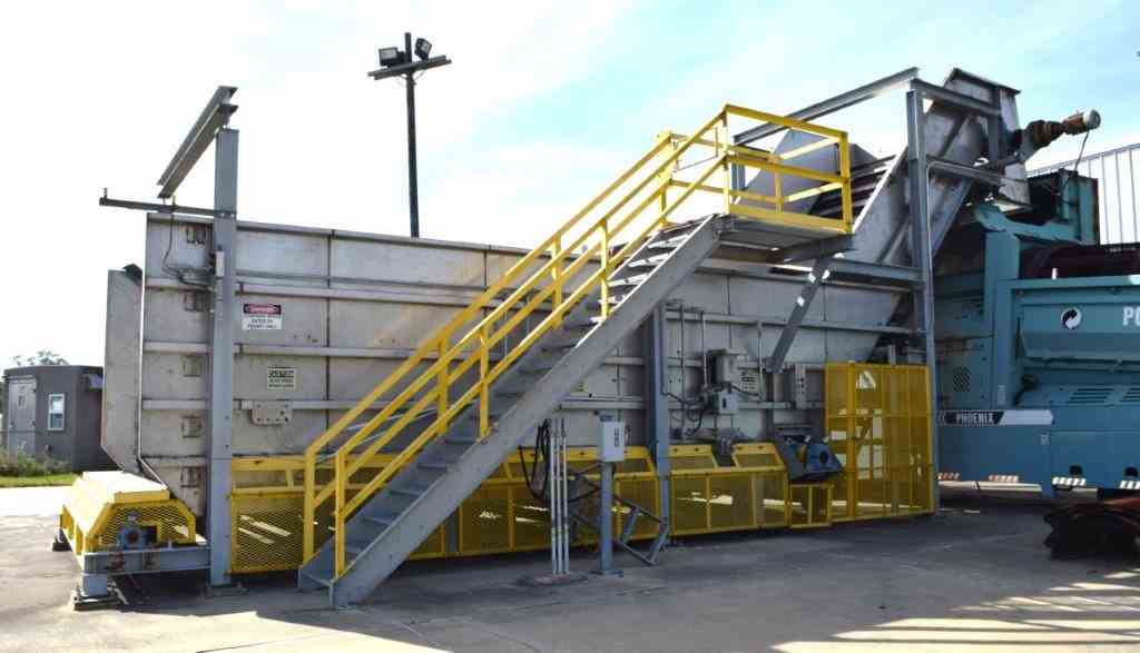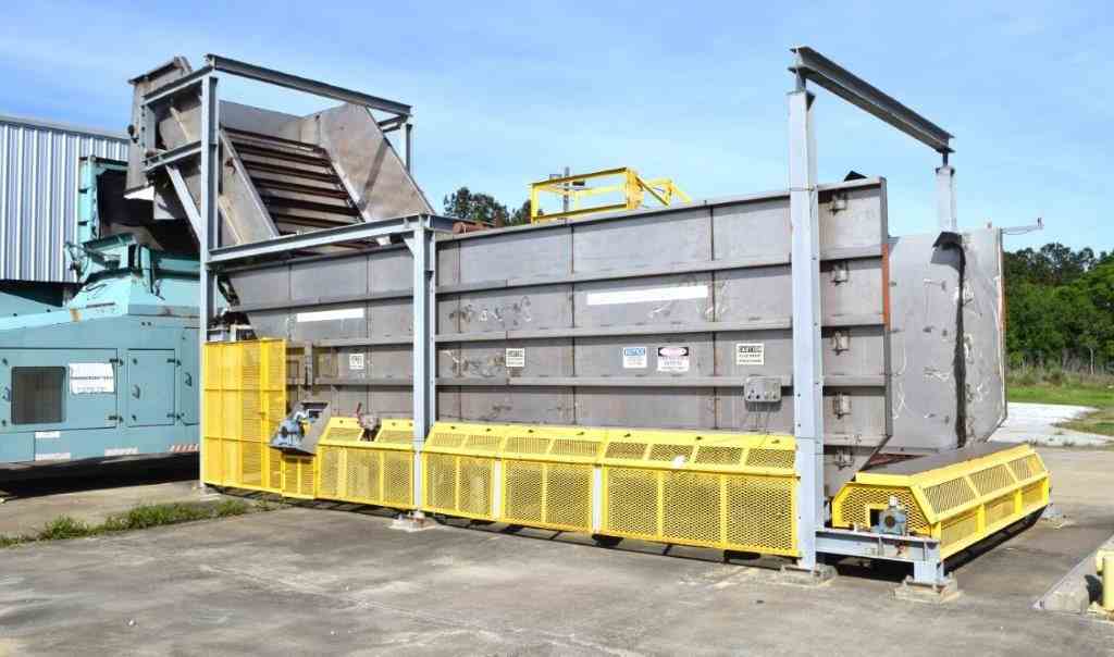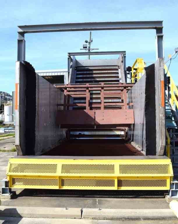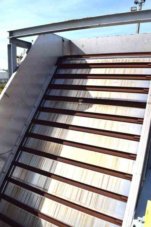 Used Inclined Feedstock Conveyor Feeder, Approximate 120" Wide. Stainless steel bottom side panels approximate 8' tall, carbon steel drag bars, driven by a motor with reducer, with (2) fixed carbon steel baffles. Approximate 18' dump height. Carbon steel frame.