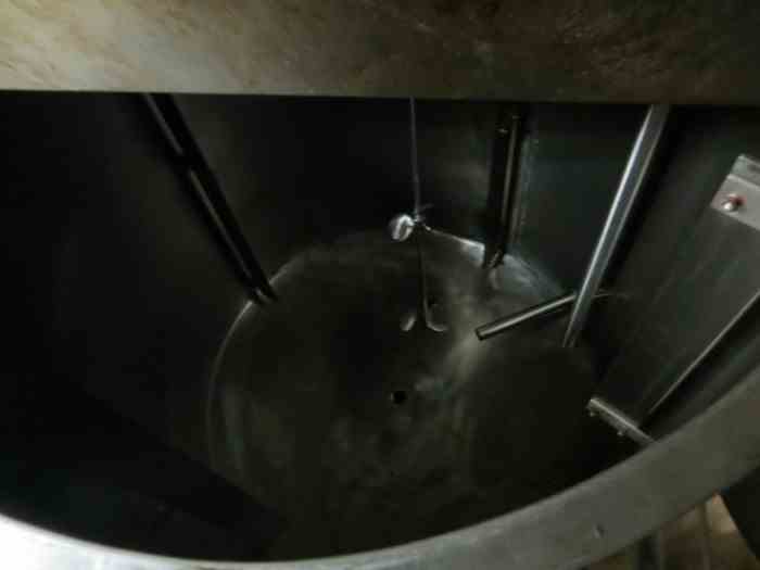 Used approximately 500 gallon vertical stainless steel tank. 4’9" diameter X 4’10” straight side. With hinged covers. Lightnin clamp-on dual prop agitator. (4) baffles.
