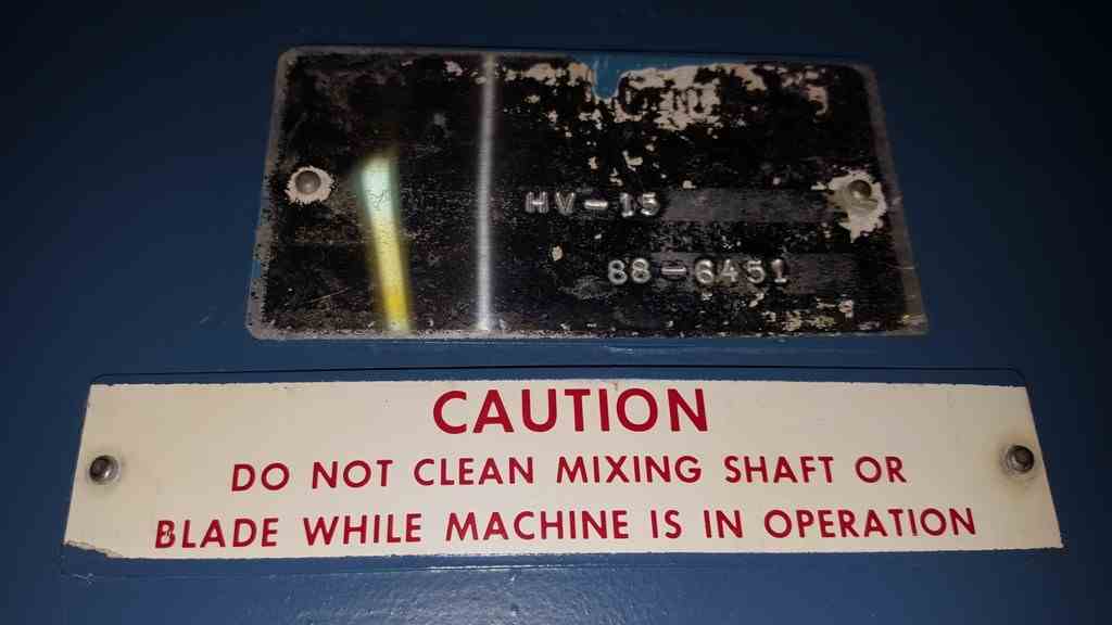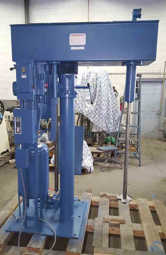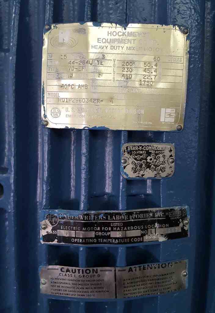 Used 15 HP Hockmeyer Variable High Speed Disperser, Stainless Steel Model HV-15 High Speed Disperser, 42" long stainless steel shaft with 8" dia. blade, 23" throat, air/oil hydraulic lift, driven by 15 HP, 3/60/200- 230-460 volt Explosion Proof Motor, variable speed, floor mount.