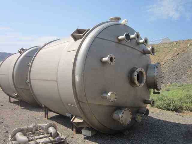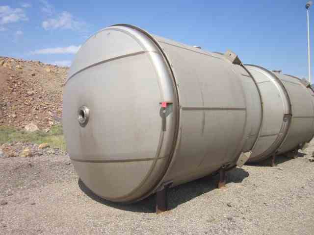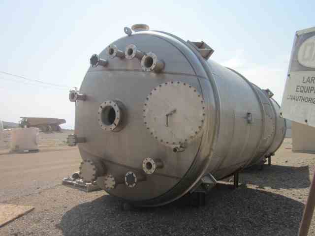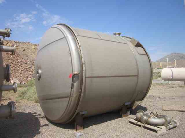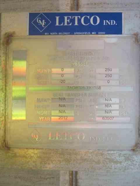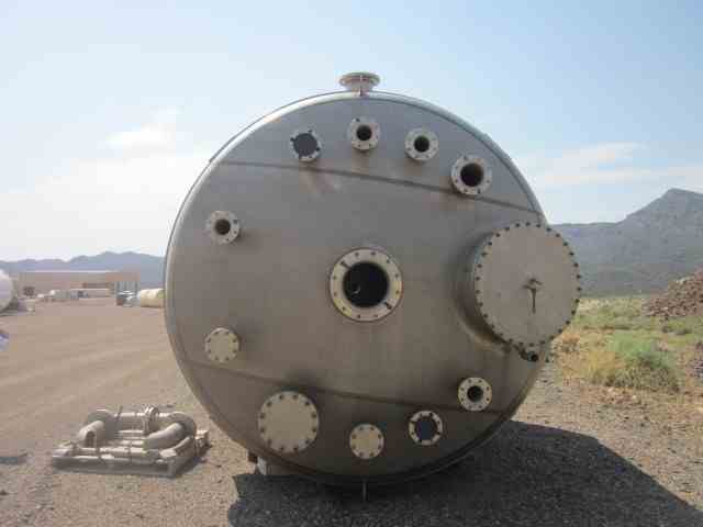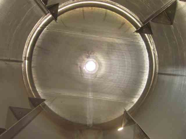 UNUSED vertical 316L Stainless Steel 6300 Gal Tank with agitator, mfg by Letco, 2012. Dished Top and bottom. 10' dia x 9'9" Straight side. Thickness: Wall-3/16"; Heads 1/4". On Leg supports. 7.5 HP Chemineer Agitator, Model 22-HTN7.5, 1800 RPM, 45 RPM output. (4) internal baffles. 1.8 specific gravity.