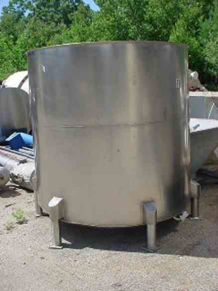 Used 900 gallon SANITARY STAINLESS STEEL TANK. 66 inch diameter x 60.5 inch sidewall with slant bottom and open top. Has 7/8 inch top lip. Believed to have a 2 piece slip on type top lid (not included). Has 1.5 inch tri-clamp bottom outlet, 1 inch threaded side outlet. (6) legs. 72 inch total width with leg pads.