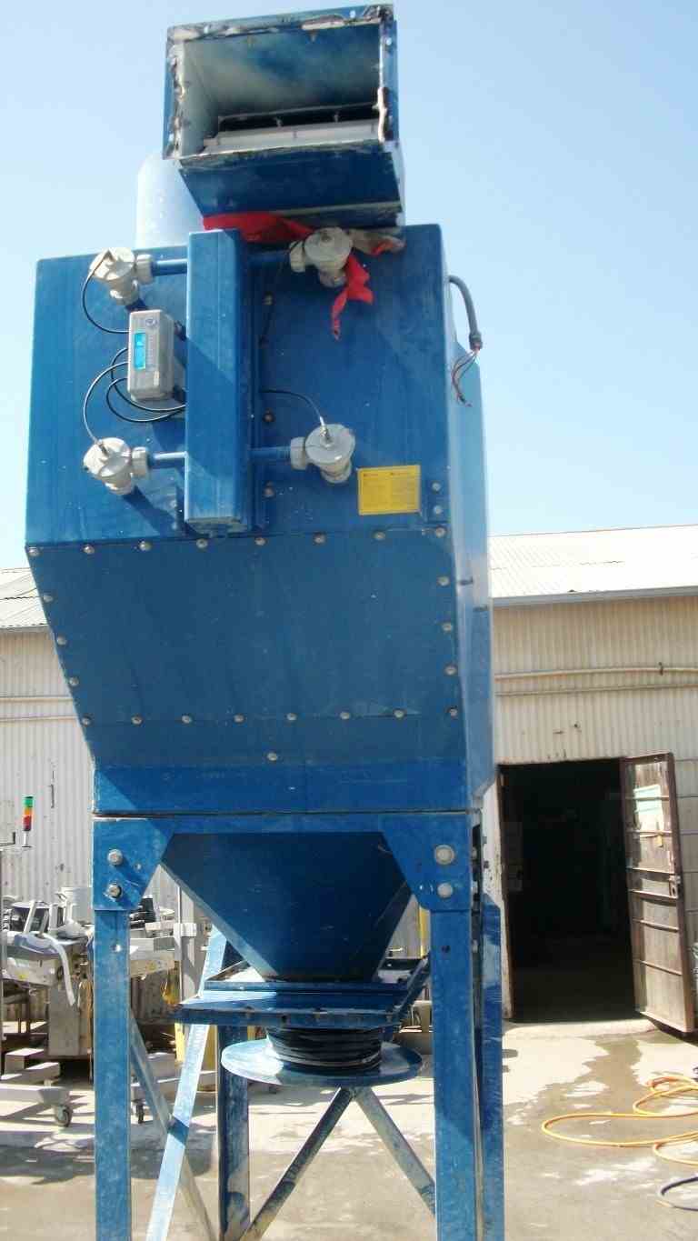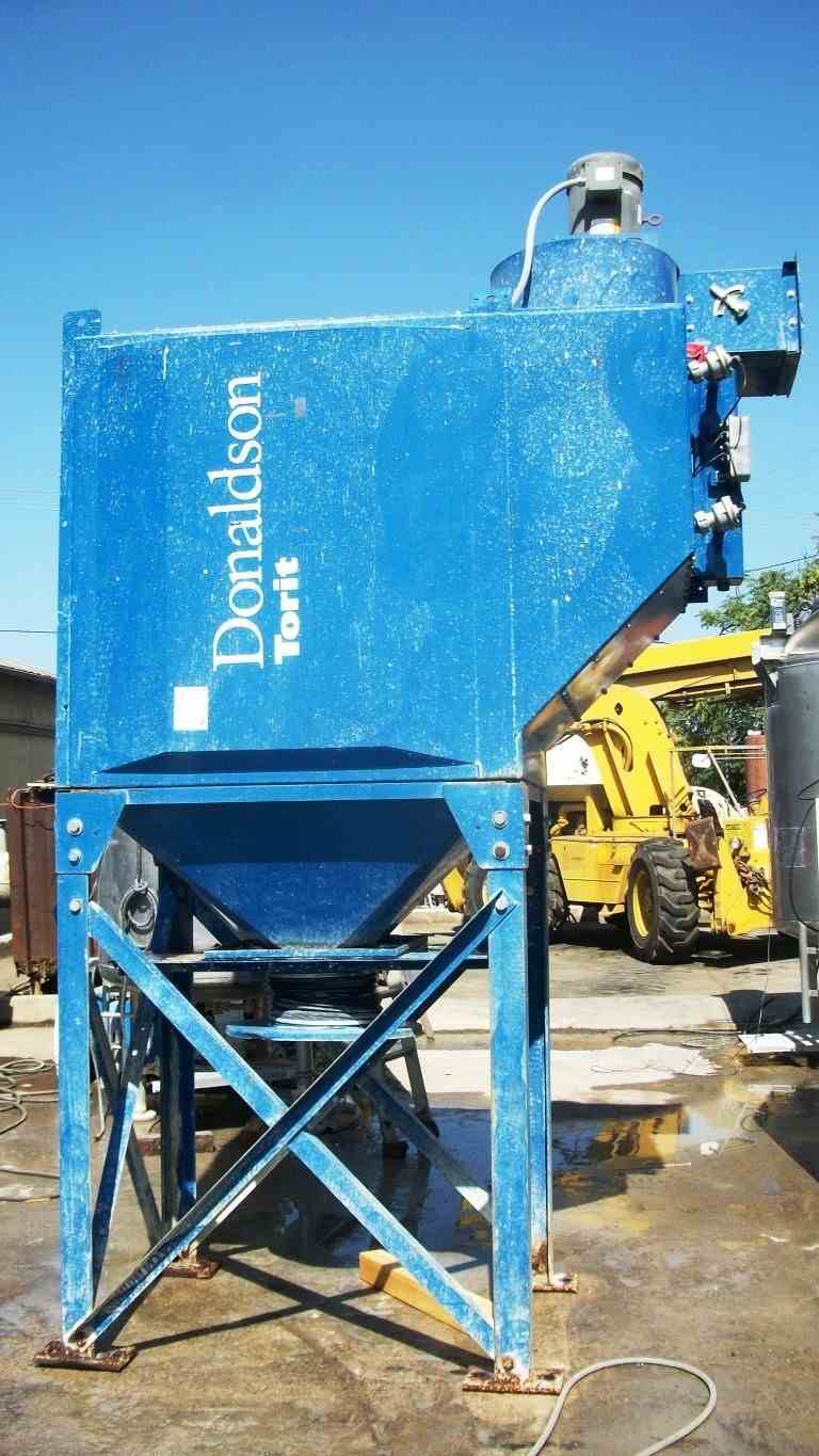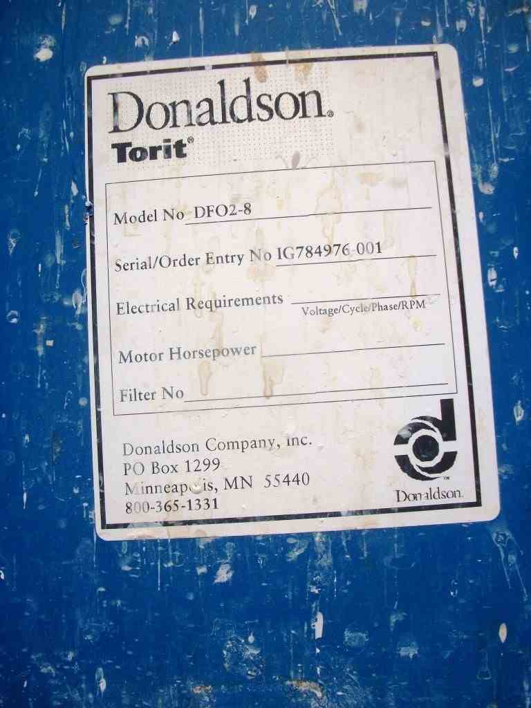 Used Donaldson Torit baghouse dust collector, Model DF02-8. Unit has approximately 1560 square foot of cloth surface area; rated for between 5000 to 6500 SCFM. Includes blower 10 HP 230/460V,3450 rpm. Serial number IG784976-001. Standard legs and hopper to accommodate a 55-gallon drum. Complete with (4) automatic pulse jet cleaning mechanisms with electrical panel for the pulse jet.