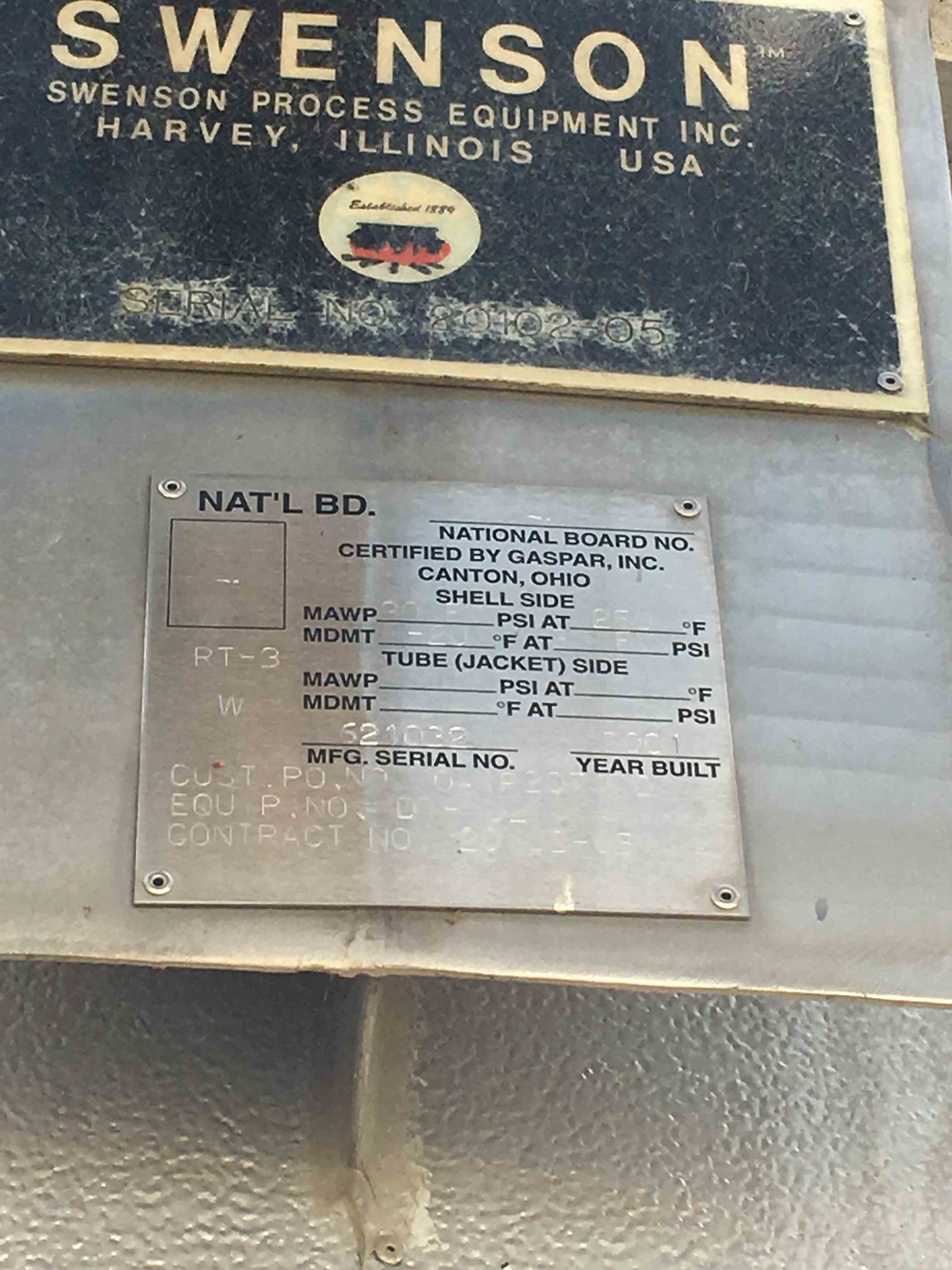 Used Sanicro 28 Crystallizer. Mfg Swenson. Second Stage DT Crystallizer. Model CR-1215. Shell MAWP 30 PSI/FV @250F. Dimensions 6'D x 17'8" TT. Cone Top and bottom. Lug Mounted. Serial #621032. Built 2001.