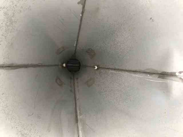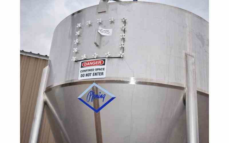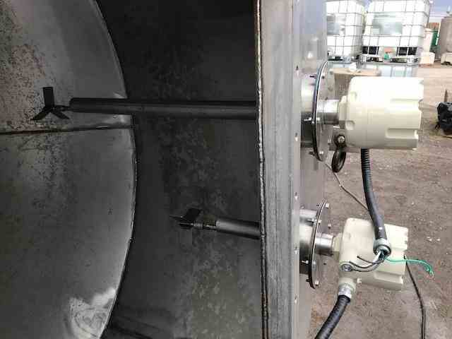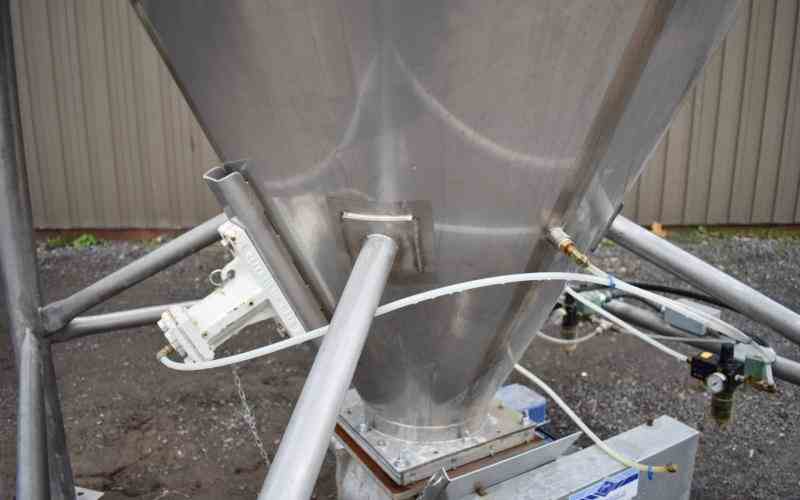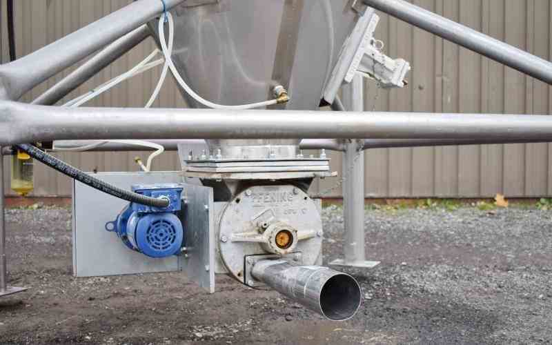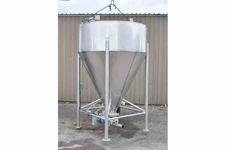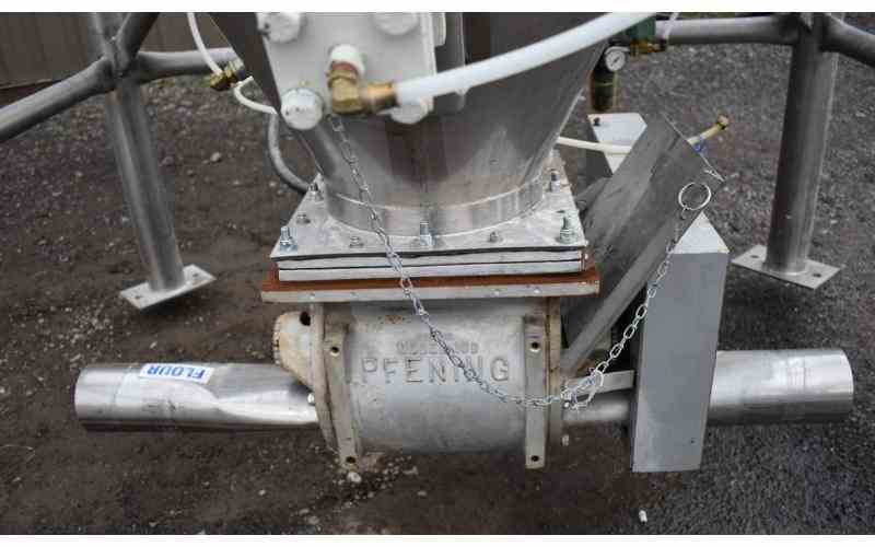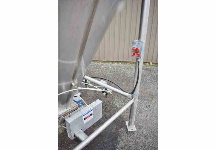 USED 1400 USG (5455 L/187 CU.FT) SANITARY STAINLESS STEEL, TANK/HOPPER WITH ROTARY VALVE. DIMENISONS: 80" DIAMETER X 100" DEEP (30" STRAIGHT SIDE PLUS 70" CONE) 45 DEGREE CONE BOTTOM. ALL STAINLESS STEEL CONSTRUCTION. TOP OPENING: 32" X 32". TWO TOP "FAILSAFE ROTARY PADDLE BIN MONITORS" (115 VOLT). TOP INLET: 4", TOP SIDE INLET: 4". 10" DISCHARGE WITH ROTARY VALVE. ROTARY VALVE MANUFACTURER: PFENING,