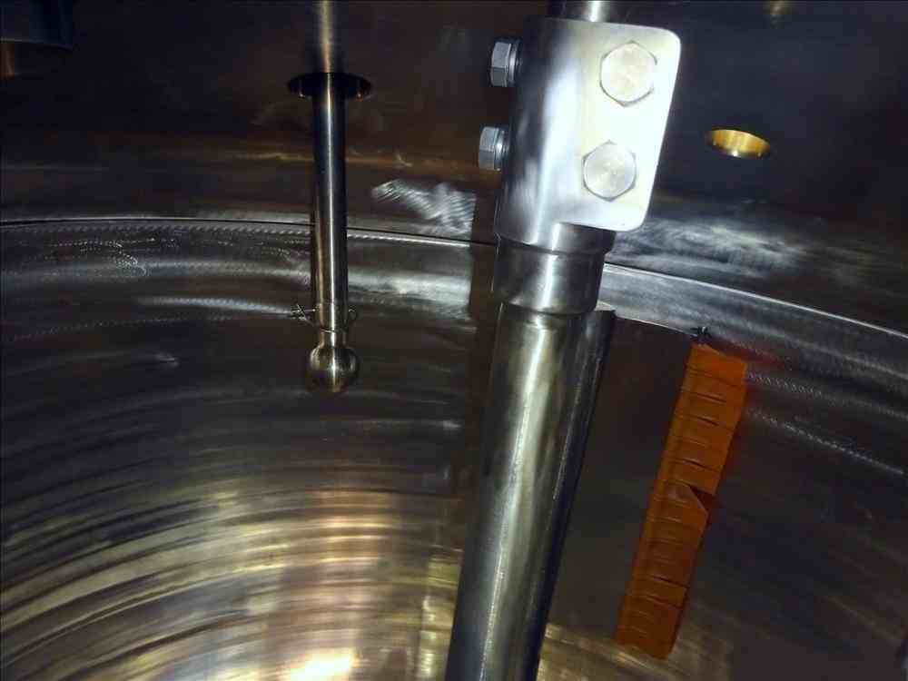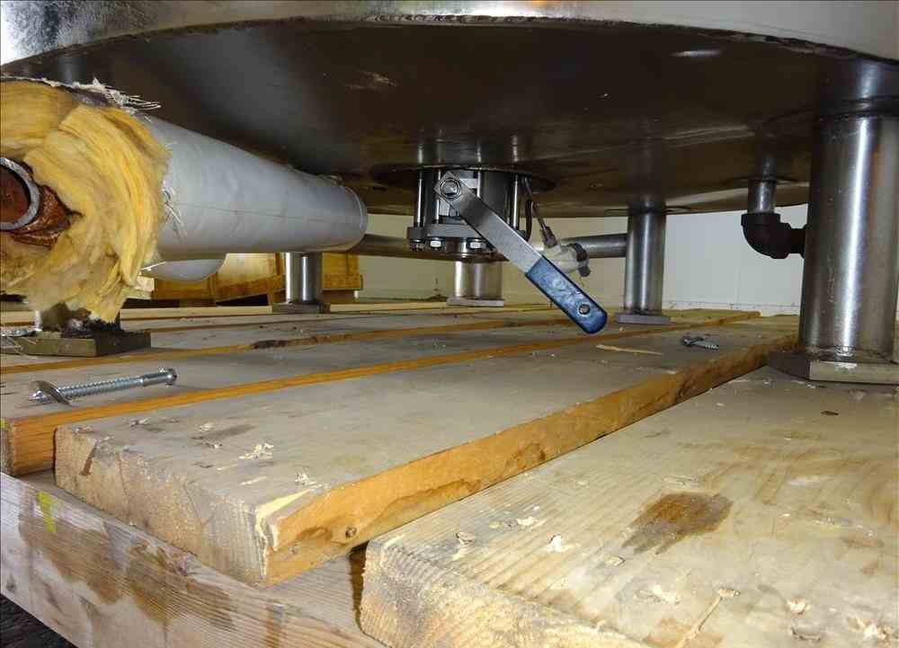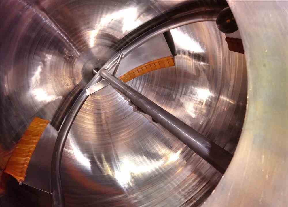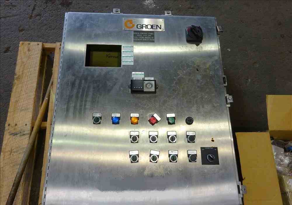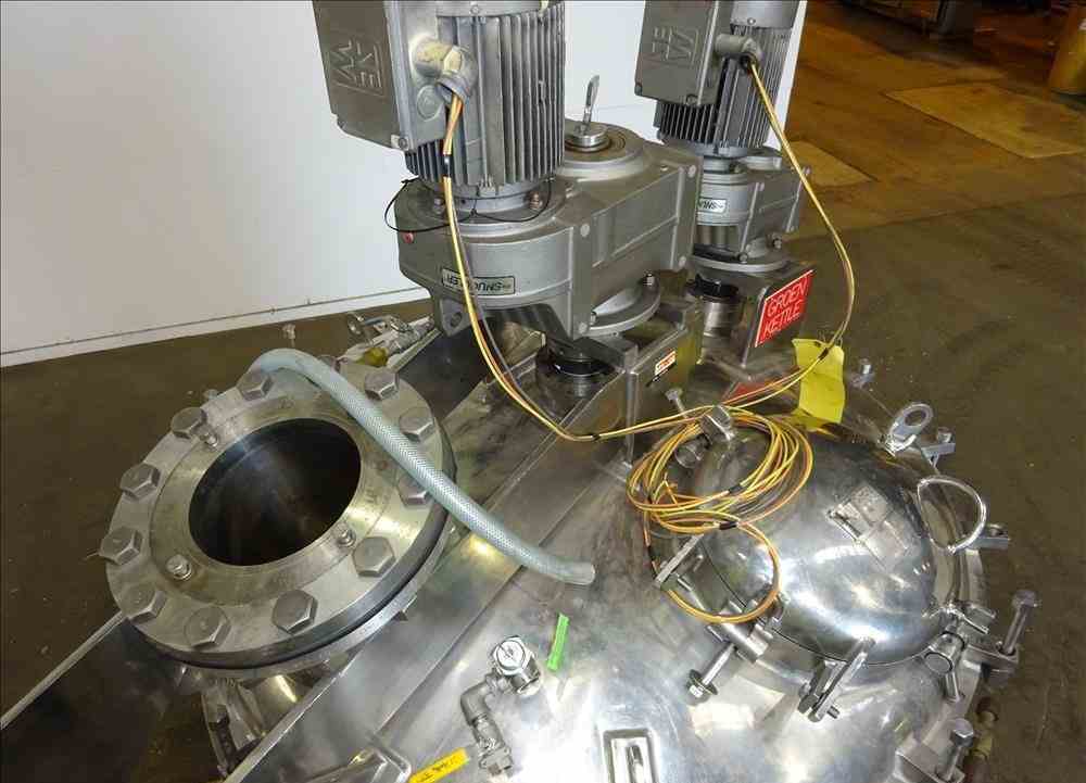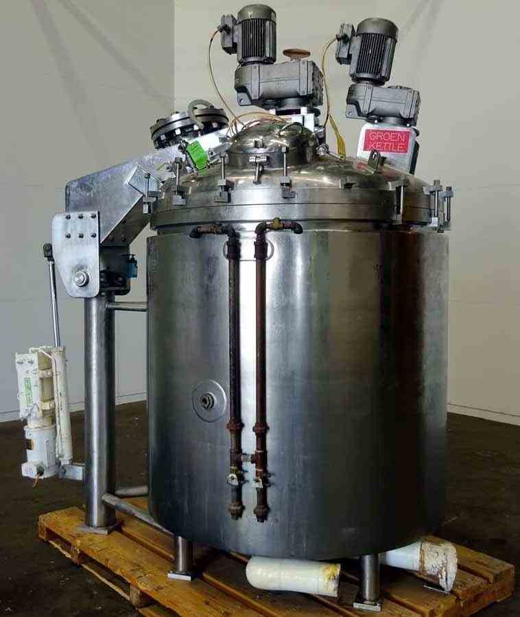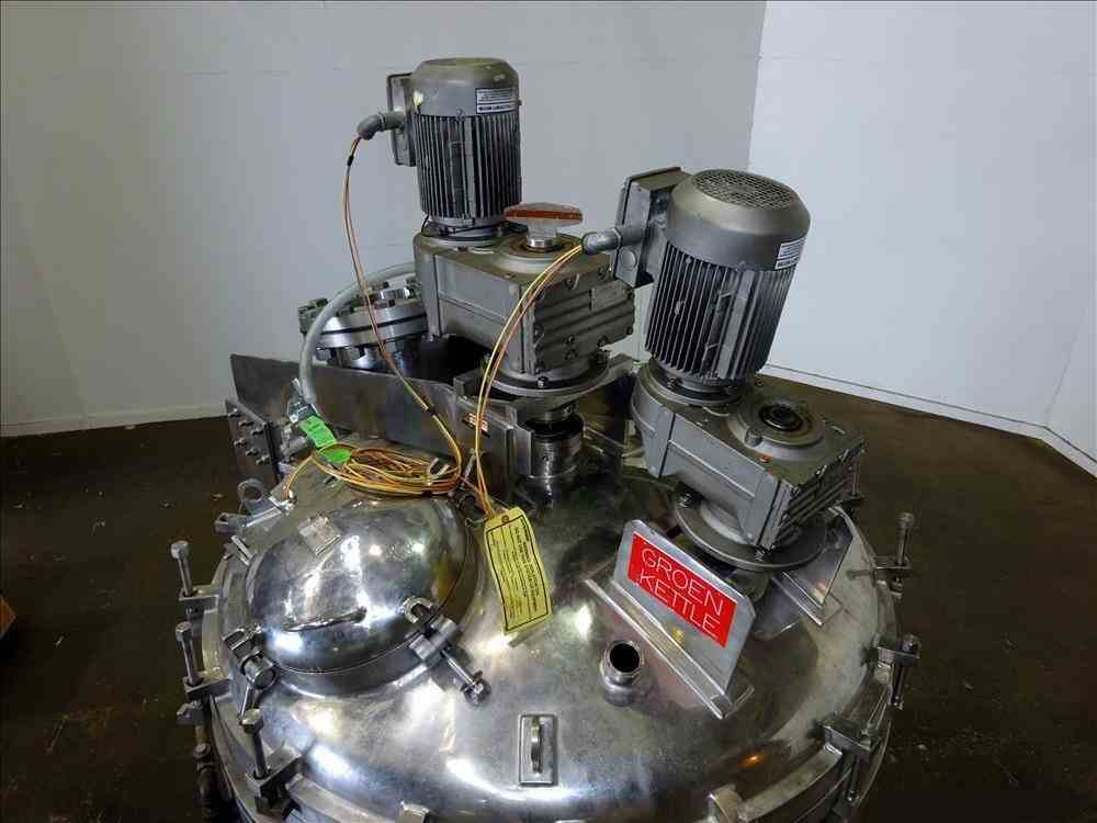 Used Groen Triple Motion Scraped Surface Vacuum Kettle, Model TA300 V/P, 300 Gallon, 316 Stainless Steel, Vertical. Approximate 54" diameter x 54" straight side, dish top and bottom. 304 Stainless steel jacket rated 100 psi at -20 to 338 degrees F, full vacuum to 25 psi. Top center entering scraper style agitator with bottom and side scrapers, driven by a 5 HP, 3/60/230/460 volt, 1680 rpm motor with 58.32:1 gearbox ratio. Top offset entering bar type agitator, driven by a 3 HP, 3/60/230/460 volt, 1720 rpm motor with 22.05:1 gearbox ratio. (1) Spray ball. Openings top: 16" manway with cover, 10", 4", 3", (2) 2", approximate 3" and 5" agitator openings with mechanical seal. 3" center bottom outlet with ball valve. Hydraulic top cover tilt. (1) Admix Rotosolver high shear mixer, Model 132RS101, Serial # 08838, 316 stainless steel, approximate 2" diameter x 64" long. (1) Admix Rotosolver high shear mixer, Model 132RS133SS, Serial # 17468, 316 stainless steel, approximate 2" diameter x 69" long, driven by a 15 HP, 3/60/208-230/460 volt, 3450 rpm motor. Control panel with EMS drive and Allen-Bradley Micro-Logix 1500 PLC. Serial # 96864-1, National Board# 138722. Built 1993.