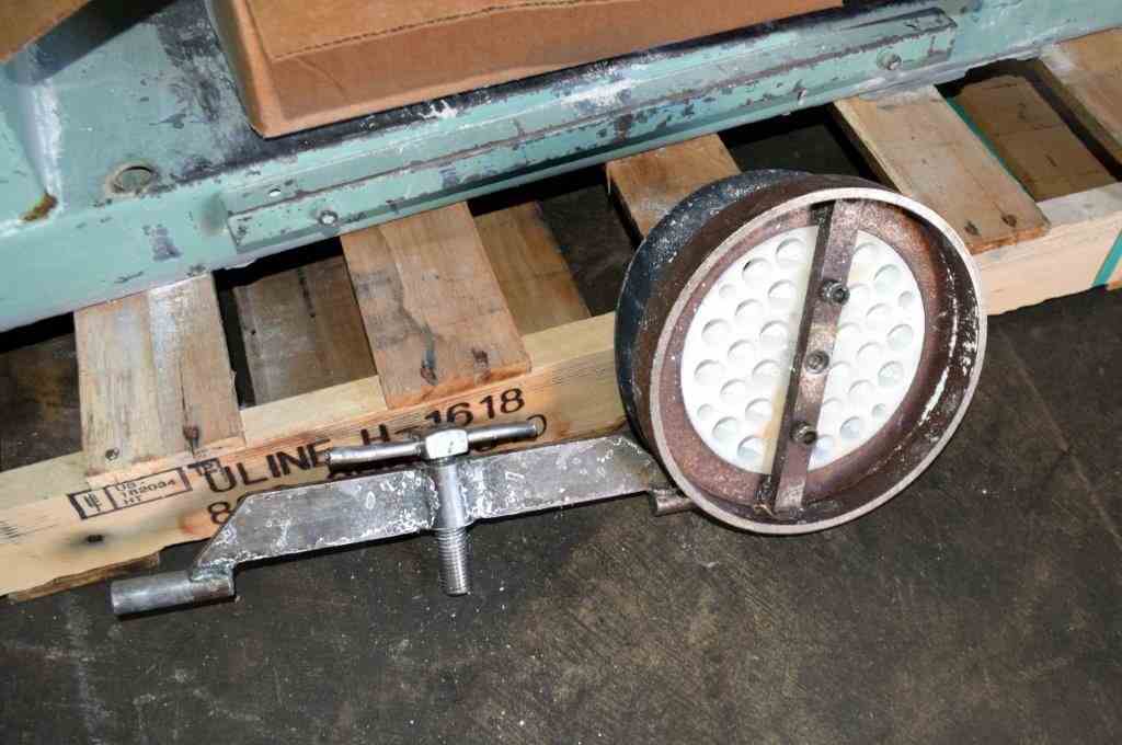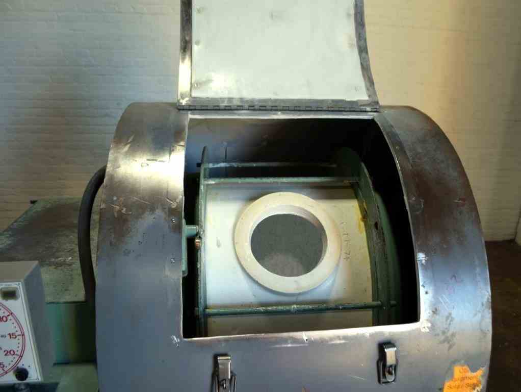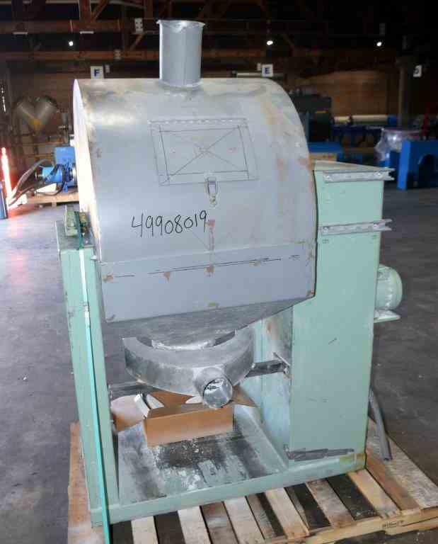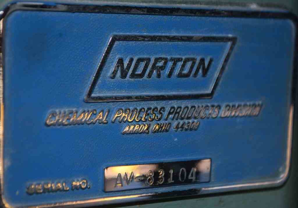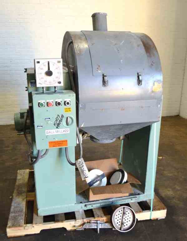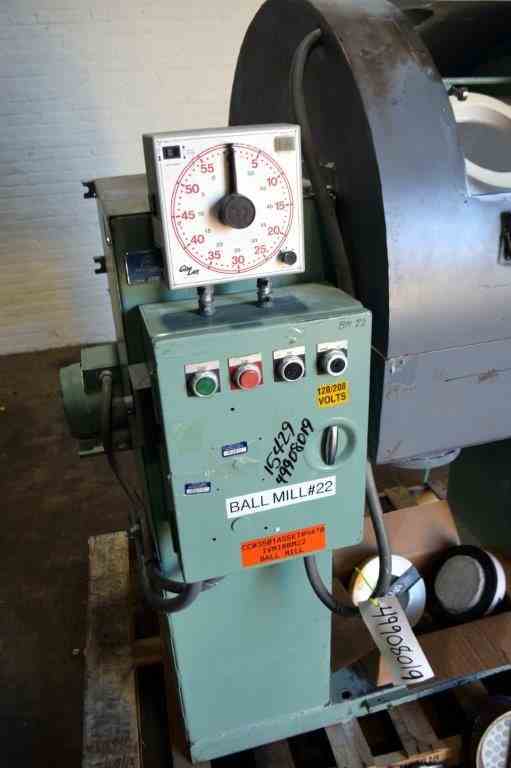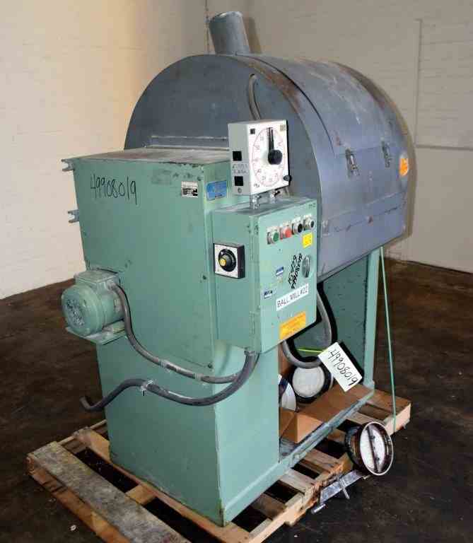 Used 25 Gallon Norton Chemical Process Products Jar Mill. Porcelain jar 20" diameter x 20" straight side. Driven by 1hp, 3/60/230/460 volt, 1730 rpm motor thru a reducer, no ratio. Inlet & outlet with cover and clamp. Mounted on carbon steel legs with a discharge housing. Serial# AV-83104.