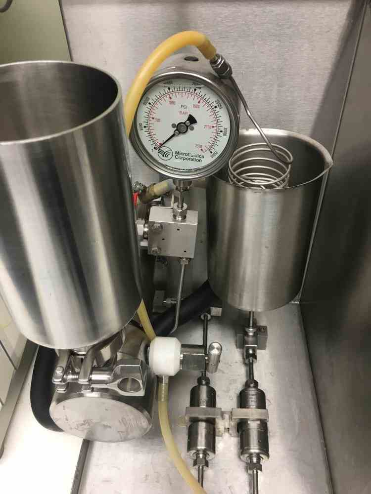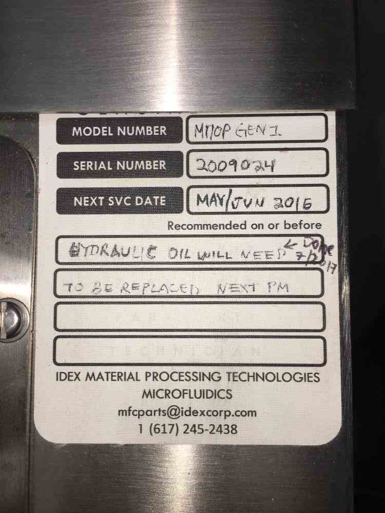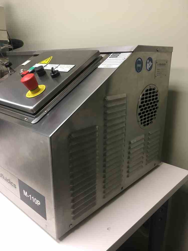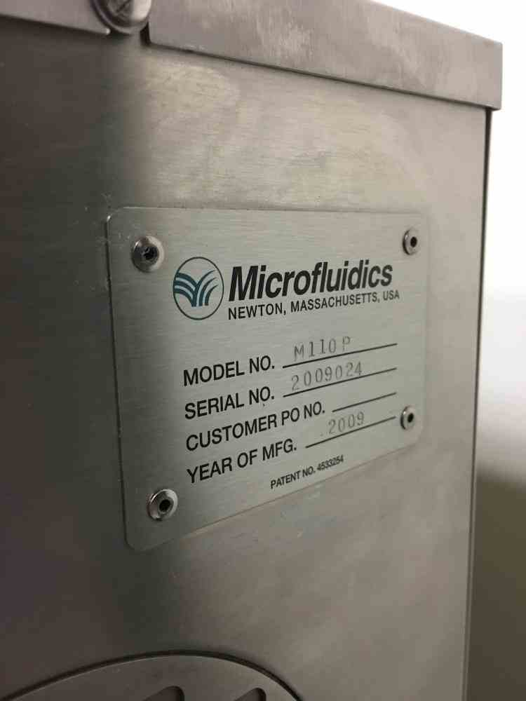 Used Microfluidics Lab Scale M-110P Microfluidizer; Pressure range: 2,000 to 30,000 psi; Minimum sample size: 31mL; Approximate flow rate: Up To 120 ml/min - 60 Hz, Up To 100 ml/min 50 Hz; Interaction chamber material: Diamond; Plunger material: Zirconia ceramic; Weight: 295lbs. Serial #2009024. Built 2009.