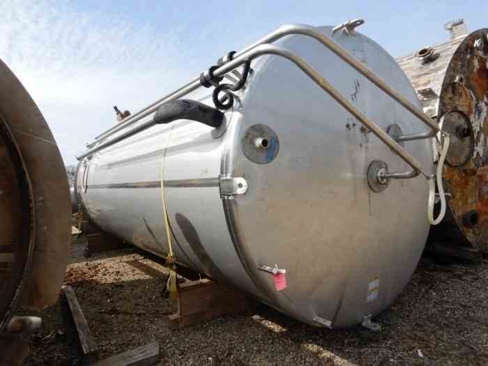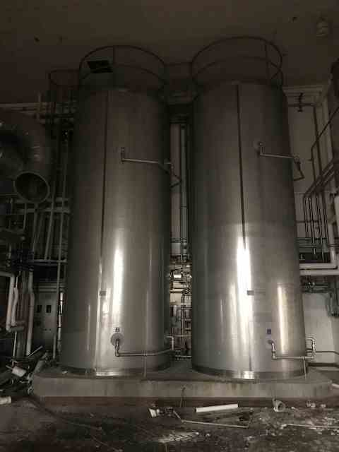 Used Approximately 6,000 Gallon Stainless Steel Vertical Jacketed Tank. Manufacturer: Mueller. Polished/sanitary stainless steel. Side entering agitator. Last used in dairy production. 7’4" Dia ‘x 20’ Straight side.