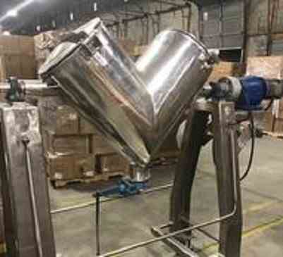 Used approximately 3 cubic foot stainless steel V type blender. Stainless steel covers and 4" bottom valve. Mounted on stainless steel stand with safety bar. 1.6 KW drive (2 HP) 3ph, 60Hz, 230/460 volt motor with gear box.