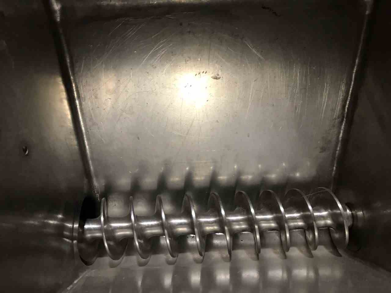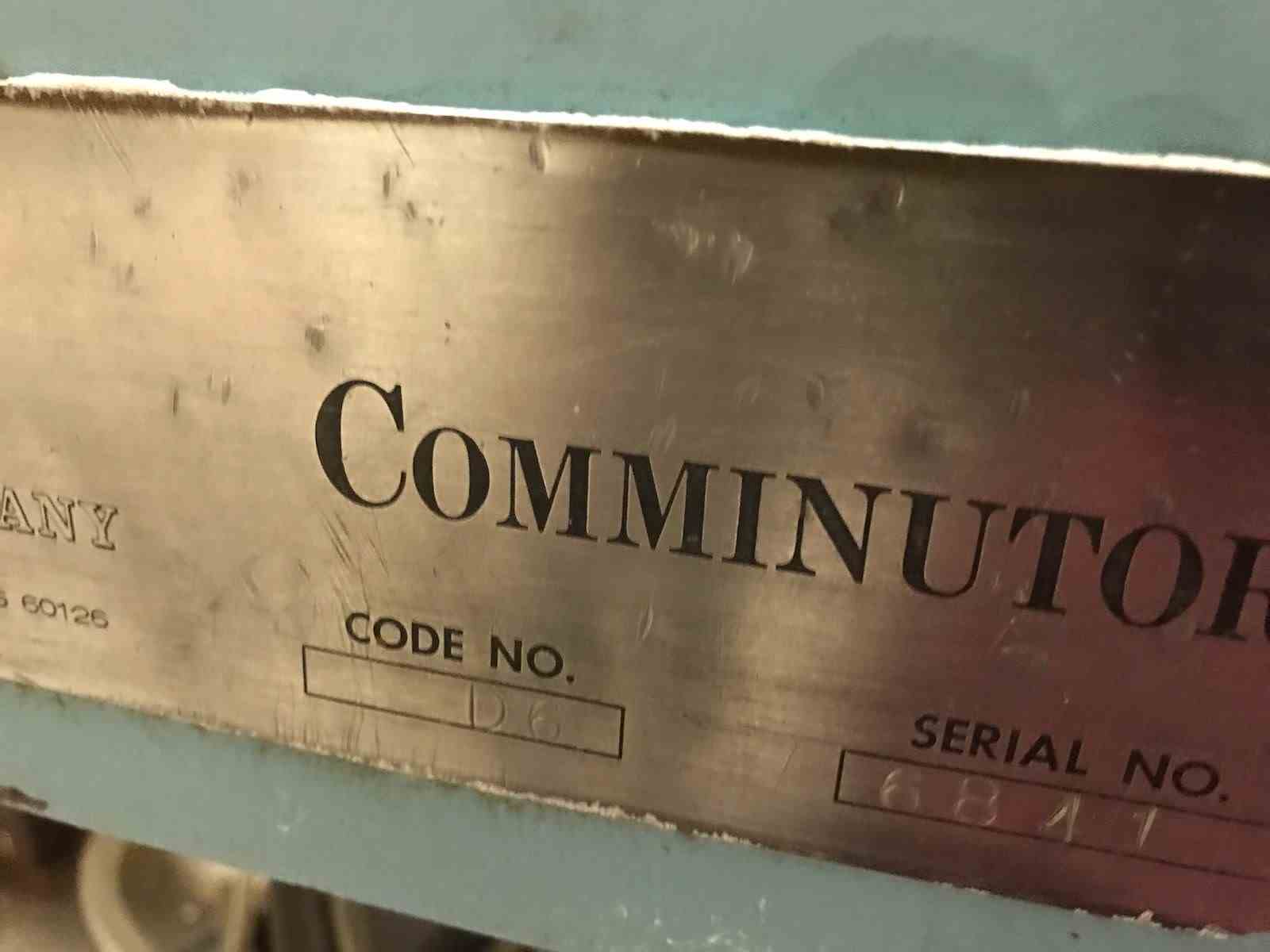Used Fitzmill Communitor SS Hammer mill. Model D6. Small stainless steel feed hopper. Screw feeder and 6" wide stainless steel milling chamber. Driven by 10 HP motor. Mounted on painted base. Serial #6841. Previously used at food processing facility.