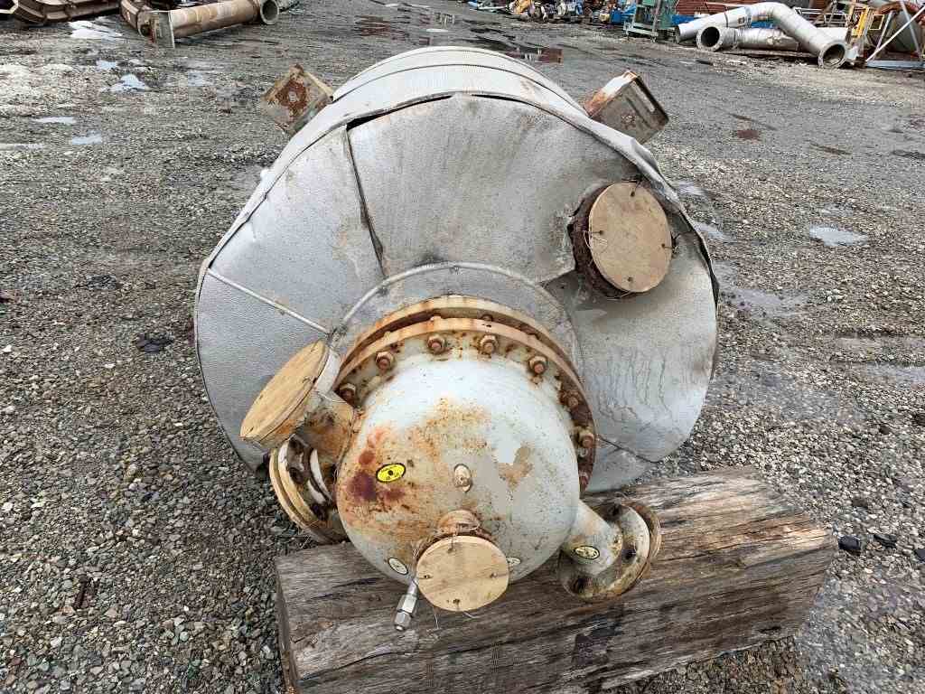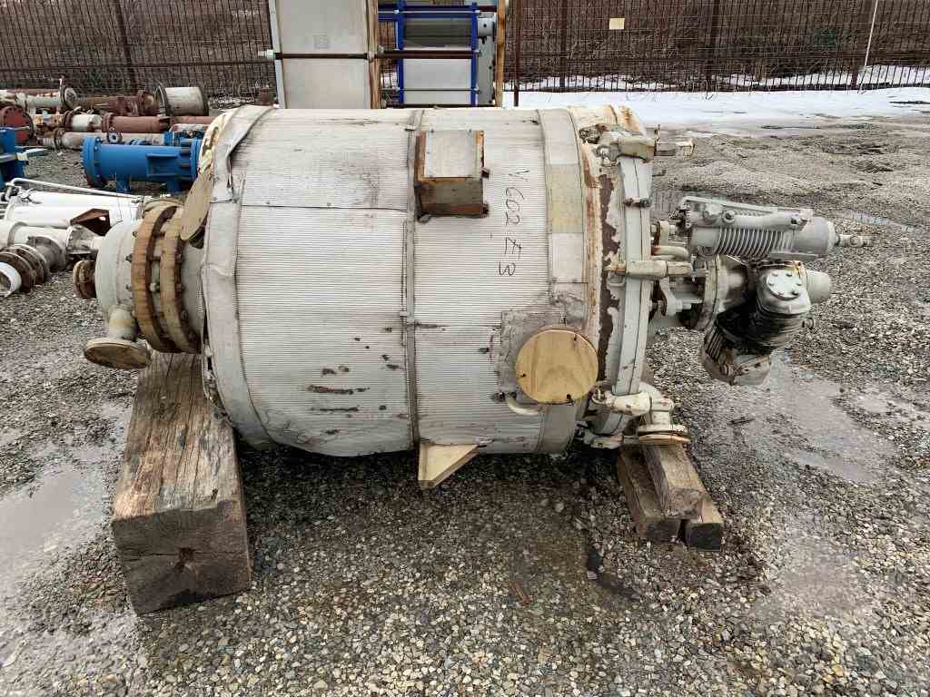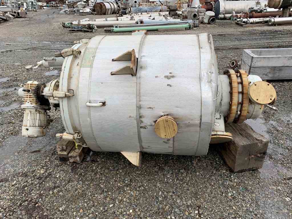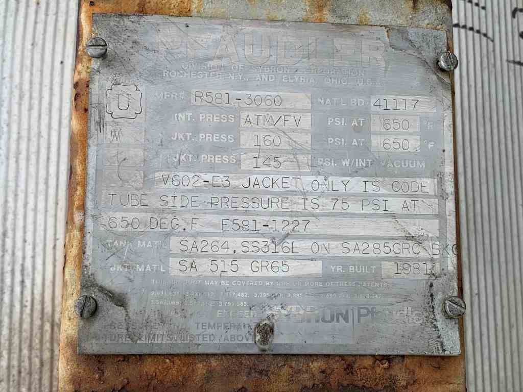 Used 25 sq ft Pfaudler 316SS Wiped Film Eevaporator. Model 25-36V-058. Internal rated FV @ 650 f internal. Jacket rated 160 psi @ 650F. 58 sq ft. Model 16042 B-U6 internal condenser with tubes rated 75 psi @ 650F, 3 DTW Pfaudler agitator drive with mechanical seal. Condenser serial# R581-1227. WFE serial# R581-3060. National Board# 41117. Built 1981.