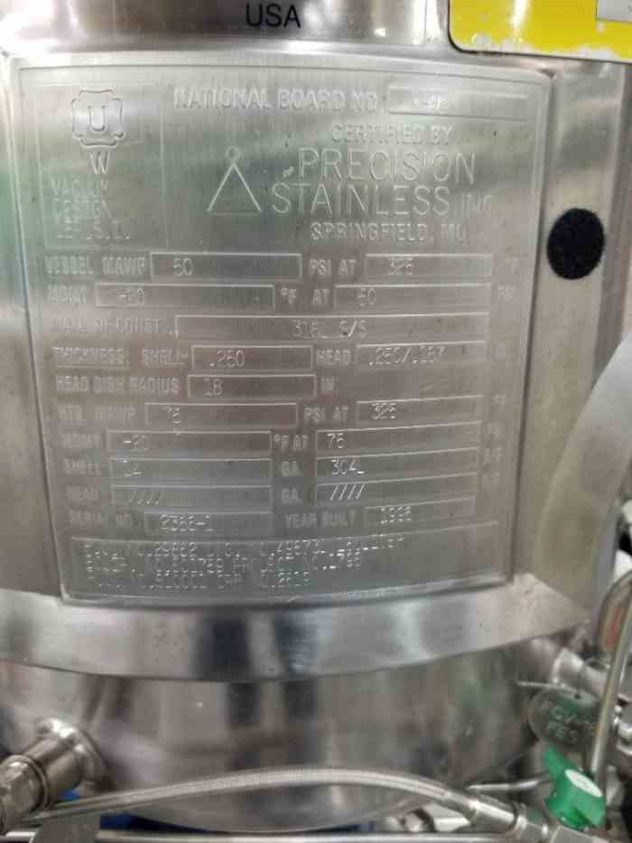 – 1500 liter Precision Stainless T316L stainless steel fermenter, rated 50# internal, 75# jacket with agitation