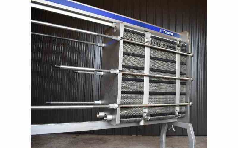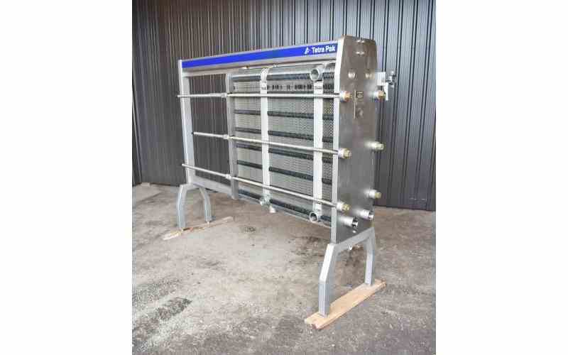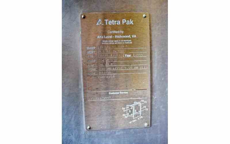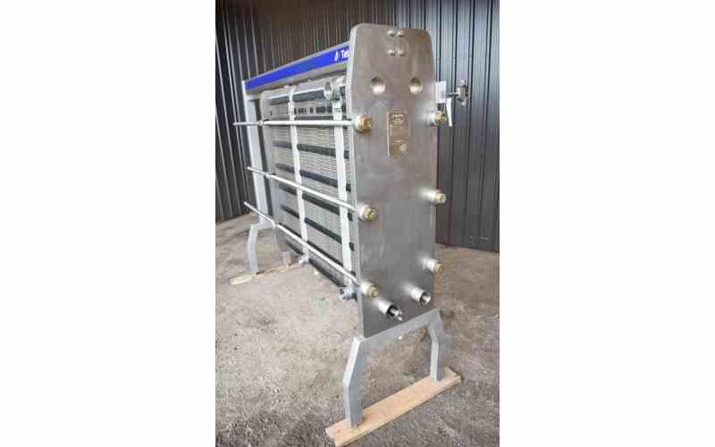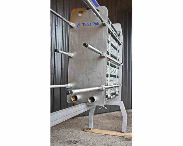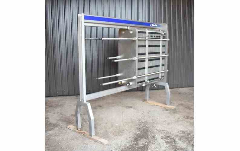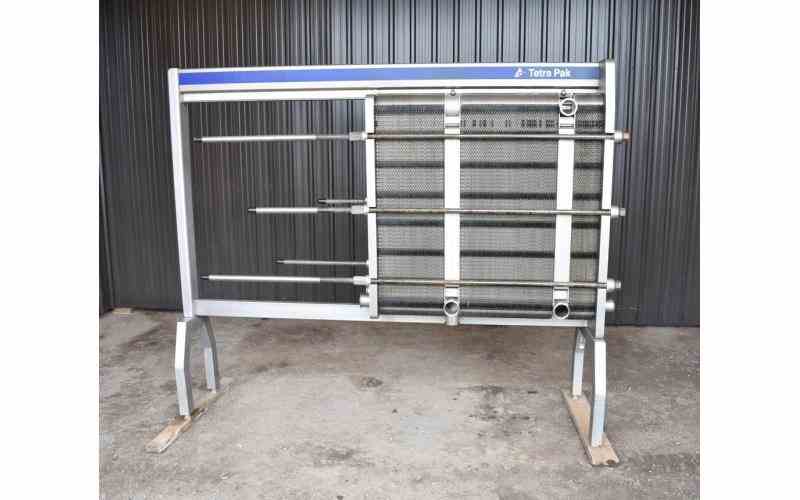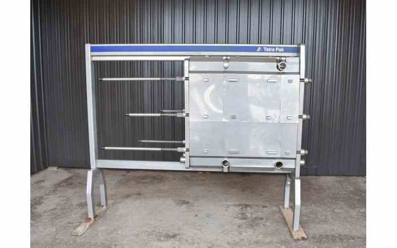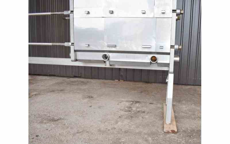 USED HEAT EXCHANGER, PLATE, 993 SQ. FT., STAINLESS STEEL, SANITARY. MANUFACTURER: TETRA PAK. MODEL: C8 SM. SERIAL NO. 30109 73613. YEAR OF MFG: 2006. INLET & OUTLET: 3" TRI CLAMP. 230 STAINLESS STEEL PLATES. OVERALL DIMENSIONS: 30" WIDE X 105" LONG X 84" HIGH