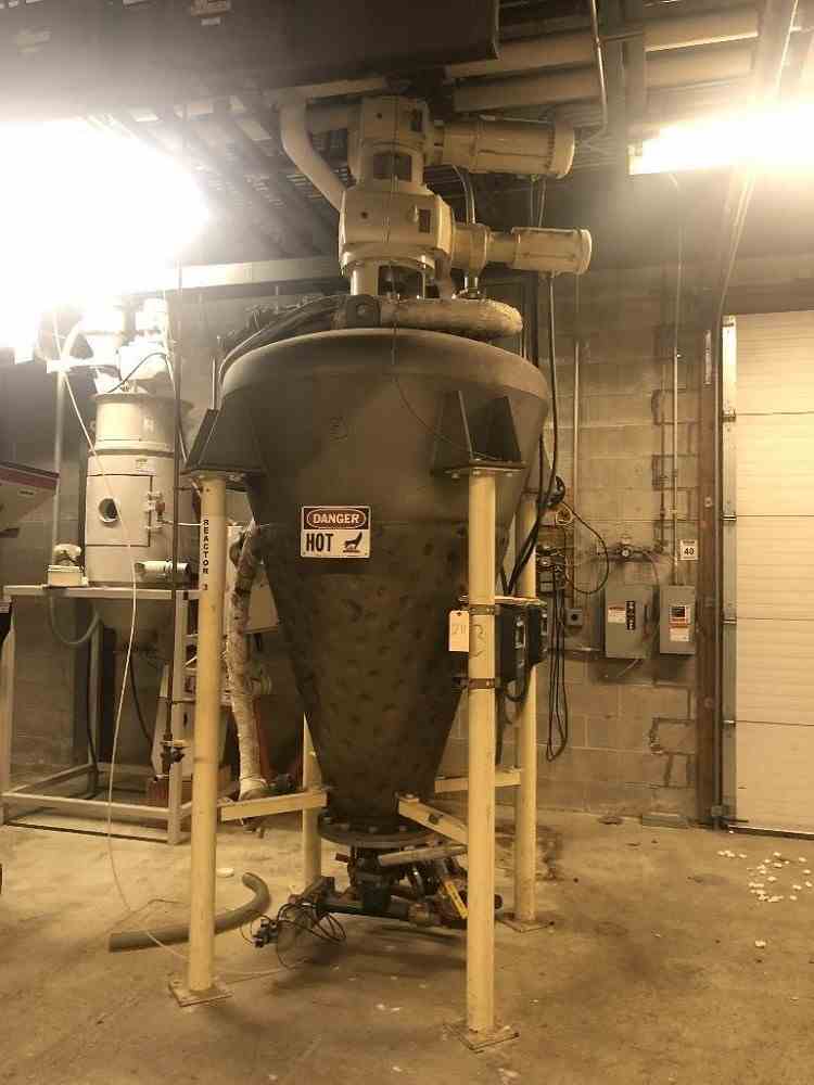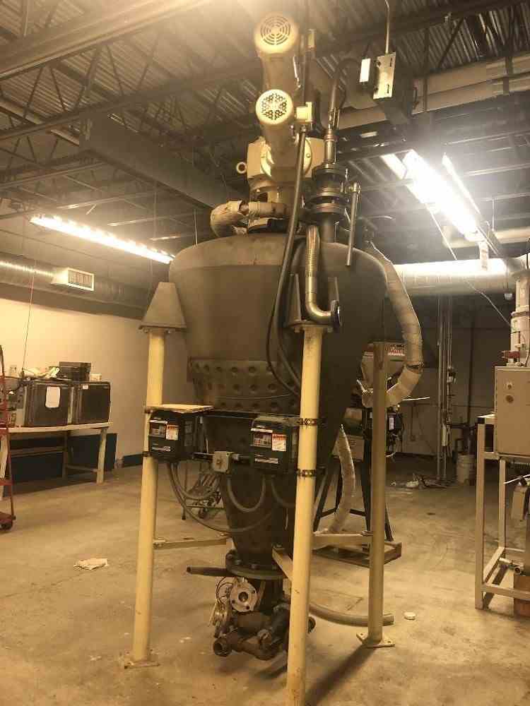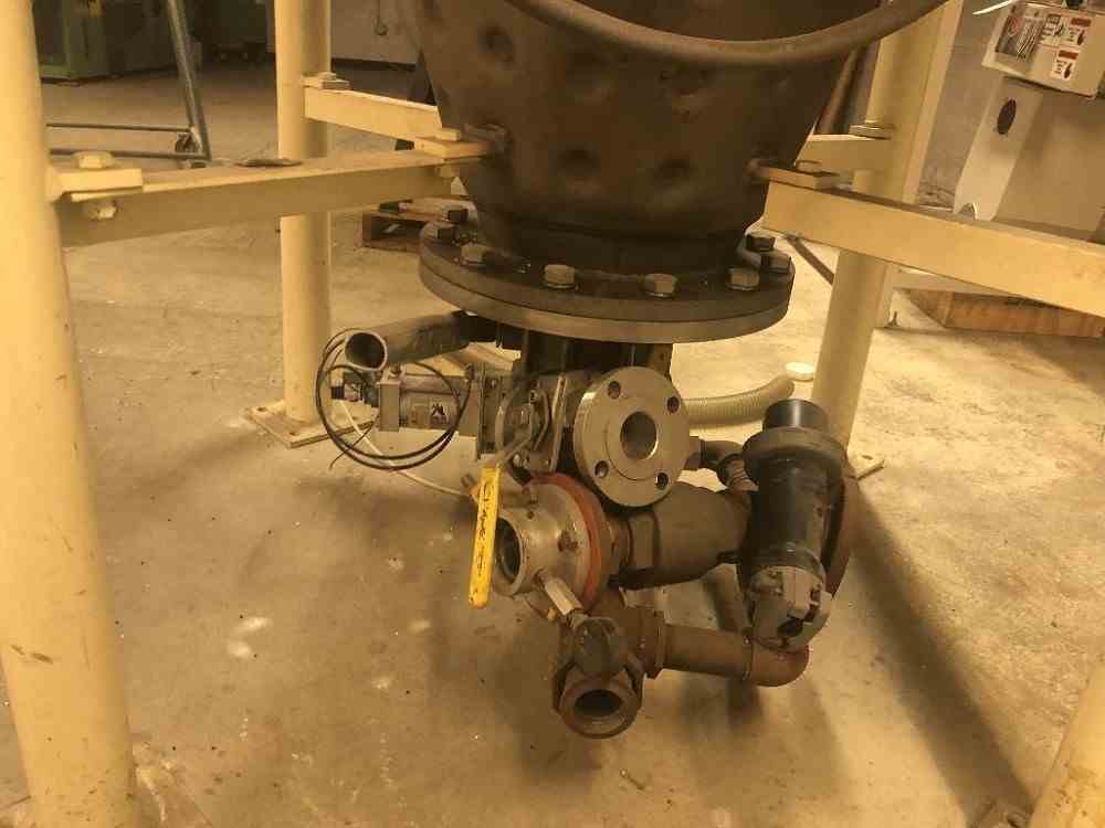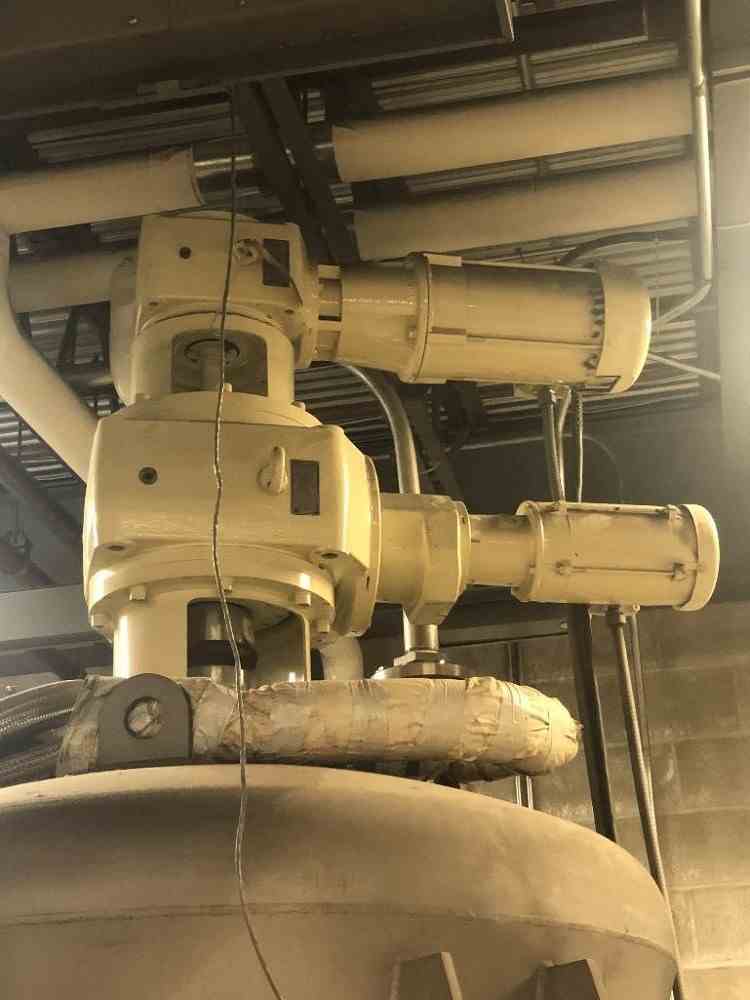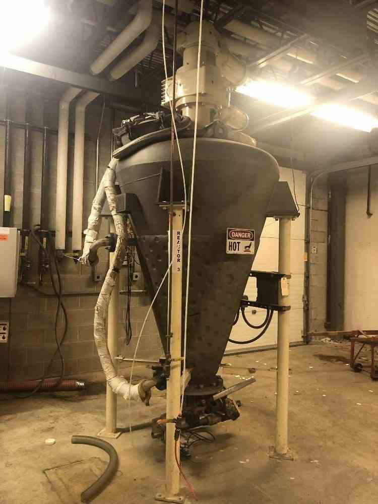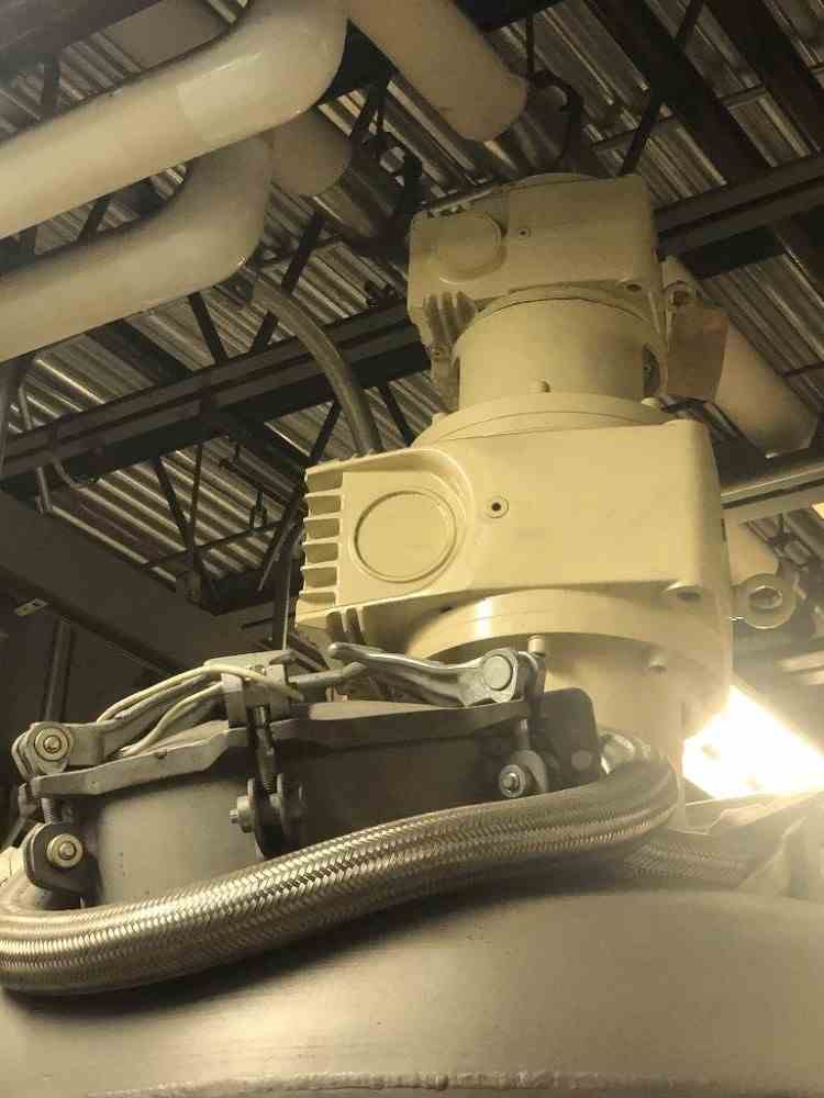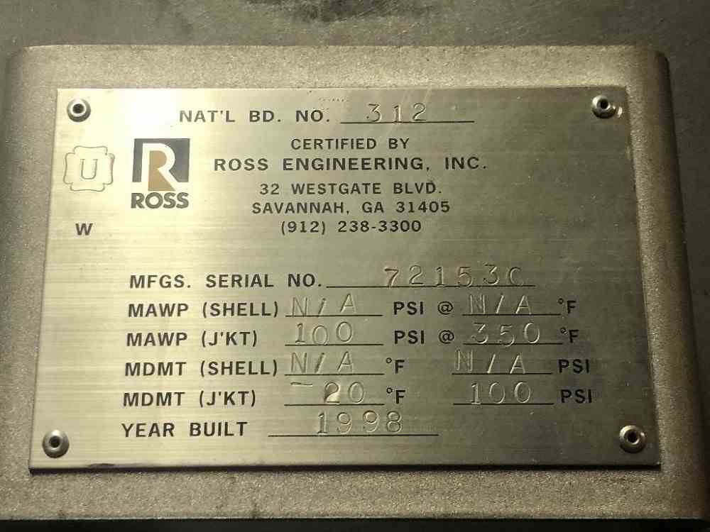 Used 3 HP Ross Model V-10 Jacketed Disperser. 10 Cu Ft of available mixing capacity. Designed for vacuum operation. Jacket is rated for 100 psig at 350 F. 304 Stainless Steel wetted parts with 80 grit polish. Non-stainless steel components are finished with a two-part epoxy coating. Cone dimensions are 48" x 70". Can start under full load. Support lugs for mounting. Totally enclosed fan cooled (TEFC) inverter duty motors designed for 230/460 VAC, 3 phase, 60 Hz. Safety limit switch to prevent operation of the agitators when the mix vessel is removed from the mixing position. Screw motor is 3 HP, 60 RPM. Swing arm motor is 1 HP, 1 RPM. Built in 1998.
