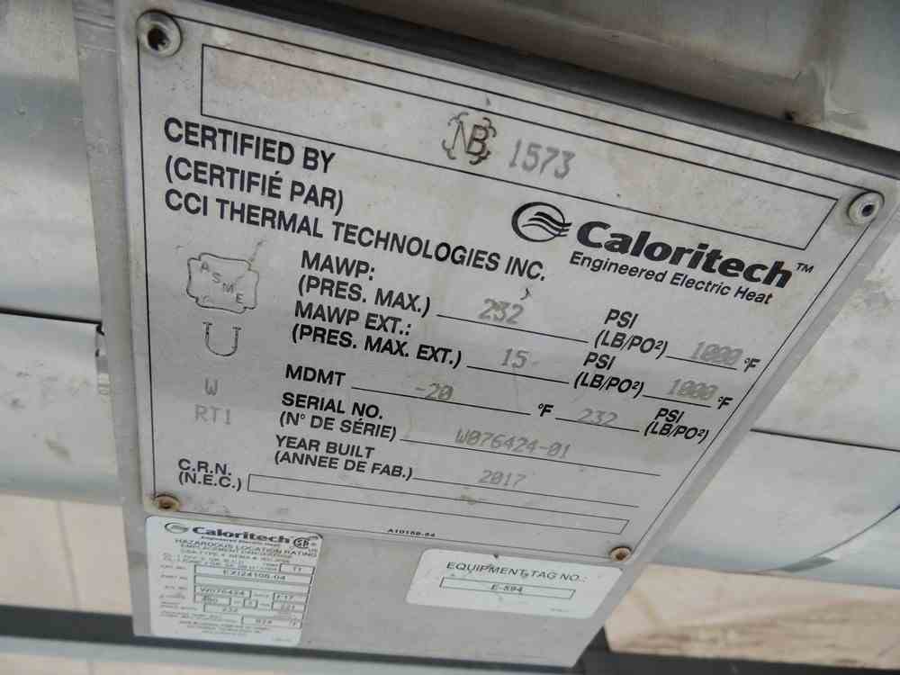 Used 60kW CCI Thermal Technology 304 SS Electrically Heated Steam Superheater 6"OD x 8"F/F. Shell rated 232PSI @1000F. Serial #W069528-01. National Board #1412. Includes Air Flange Heater bundle. Serial #W069528-02. National Board #1404. Built 2015.