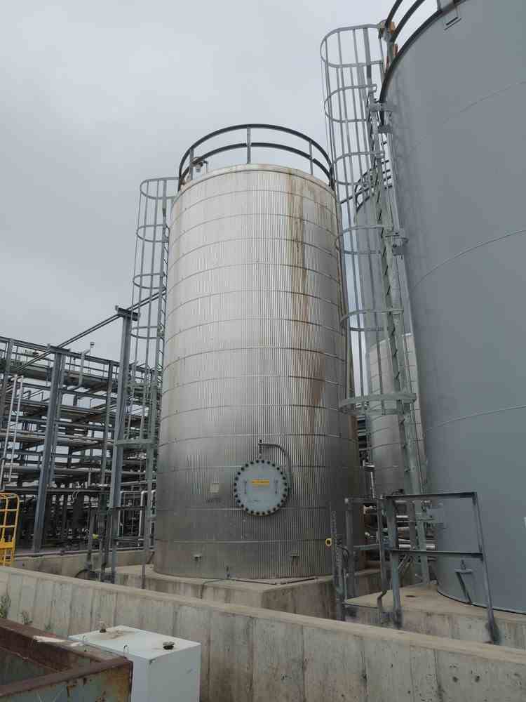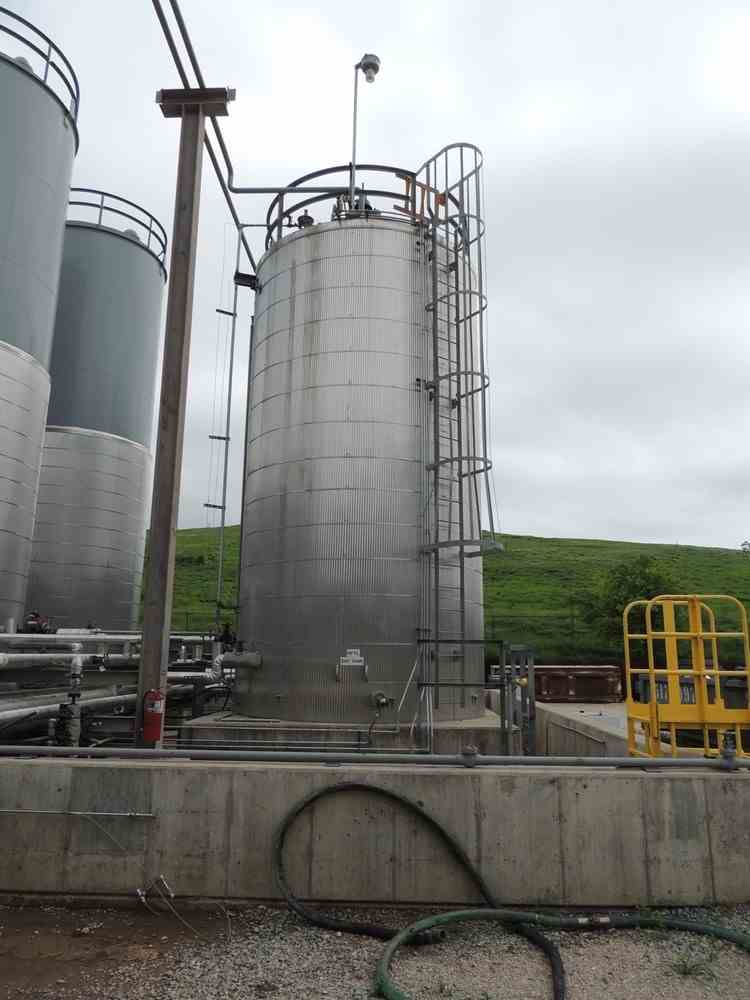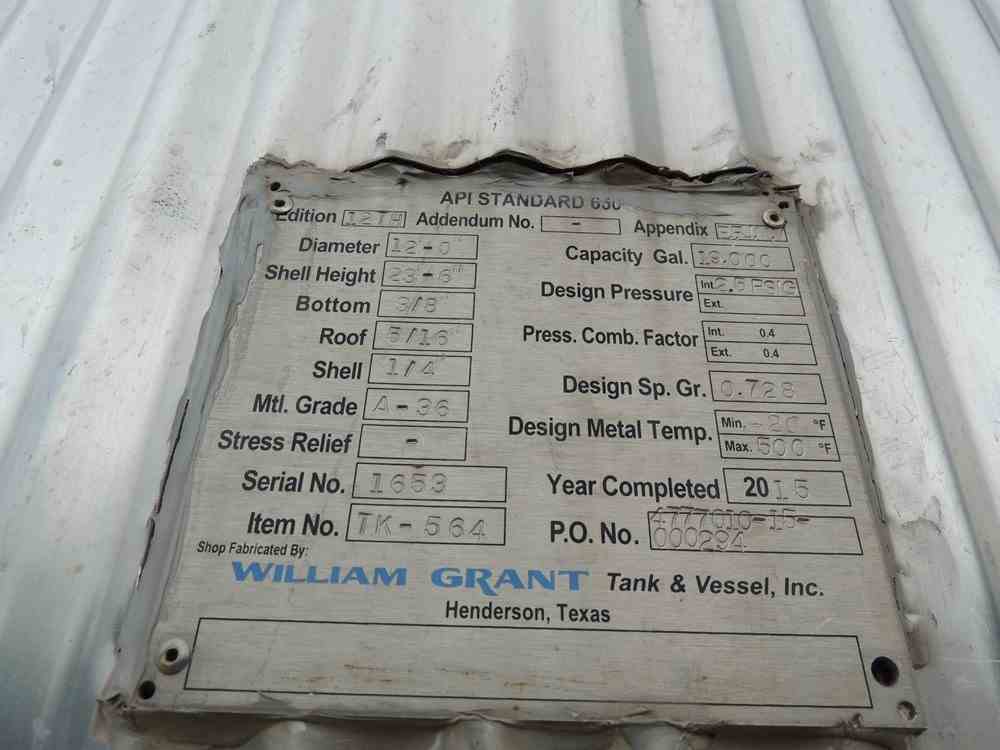 Used 19,000 Gal William Grant Carbon Steel Tank. Rated 2.5 psig @ 150F. Wall .25" thick. Design specific gravity of .728. Flat bottom and cone top. Supported by bottom head. Single row of internal bottom heating coils. 12'0" ID x 23'6" T/T . Estimated weight 13,000 lbs. API-650 coded. S/N # 1653. Built 2015.