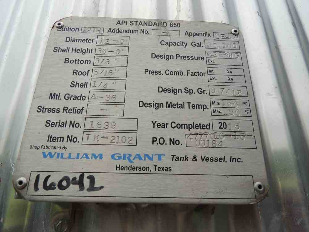 Used 30,000 Gal William Grant Carbon Steel Tank. Rated 2.5 psig @ 500 F. Wall .25" thick. Design specific gravity of .7412. Bottom and cone top. Supported by bottom head. 12'0" ID x 36'0" T/T. Estimated weight 18,000 lbs. API-650 coded. Last used to store Diesel. S/N # 1639. Built 2015.