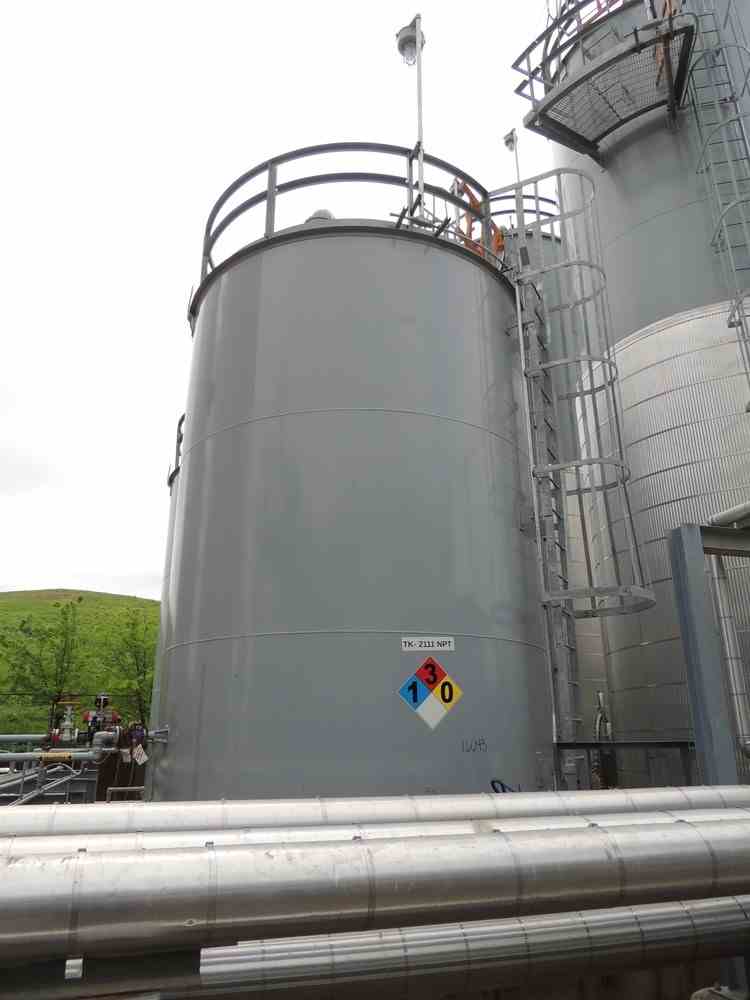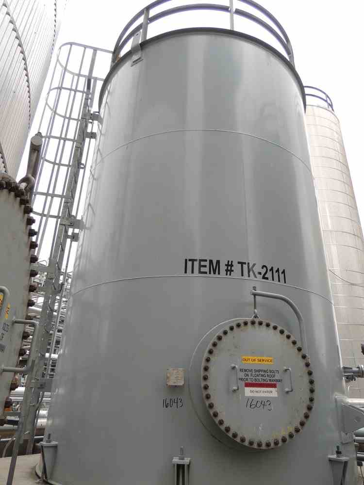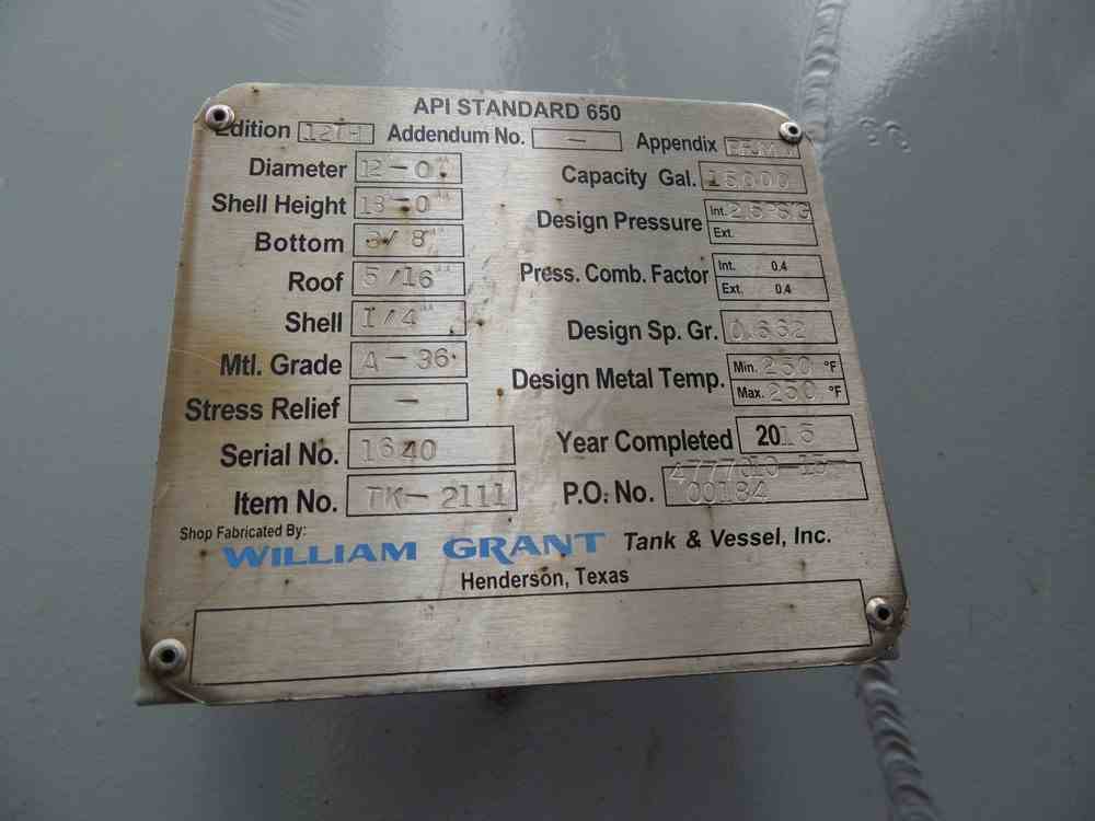 Used 15,000 Gal William Grant Carbon Steel Tank. Design specific gravity of .662. Flat bottom and cone top. Supported by bottom head. Aluminum Pontoon Floating Roof. 12'0" ID x 18'0" T/T. Estimated weight 11,555 lbs. API-650 coded. Last used to store Naptha. S/N # 1640. Built 2015.