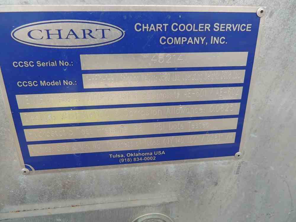 Used 197.42 Sq Ft 304L SS Fin Fan Heat Exchanger. Mfg Chart. Model H72. 197.42Sq Ft (bare), 4237 Sq Ft (extended). (86) 1" OD tubes - 4-pass. Rated 75PSI@300F. (1) Force D 10HP Fan drawing 6600 lbs. National Board. Built 2015. Includes 124 Sq ft CS Heat Exchanger tube bundle. (54) 1" OD Tubes rated 75PSI @300F. National Board. Built 2015. Past use LFTL Distillate Condenser and Diesel Fractionator air Cooler.