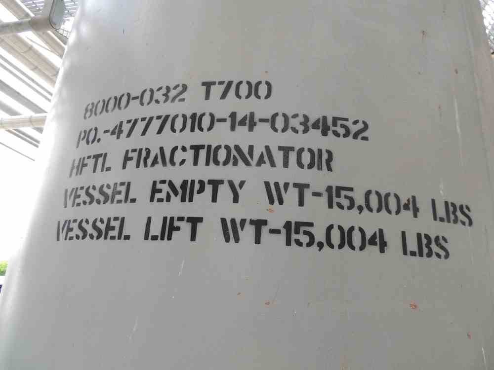 Used 20" Ventech Packed Carbon Steel Fractionation Column. 20" upper 33' and 48"Dia x lower 7' (short section). 40' 3" T/T. (4) Packed Beds. Shell Rated 129PSI @550F. Skirt Mounted. Serial #D8000-032-T700. National Board #48. Built 2015. Weight 15100 lbs.