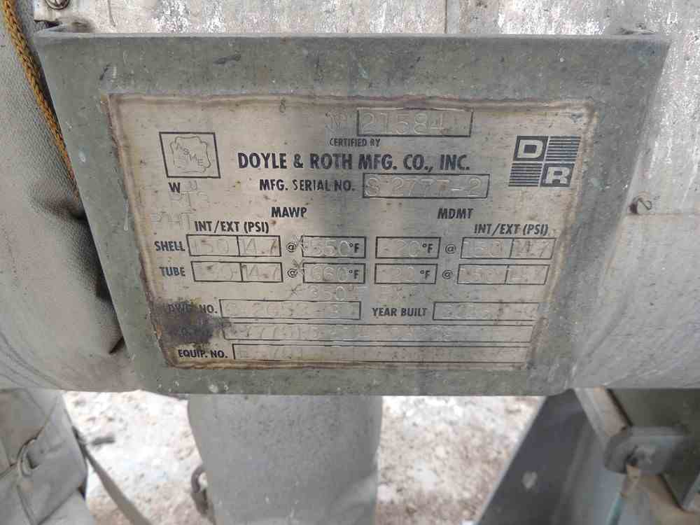 Used 86 Sq Ft Doyle and Roth Horizontal Carbon Steel Shell and Tube Heat Exchanger. Shell rated 150PSI/FV @ 550 F. (44) .75"OS x 10'L tubes rated 150PSI/FV @ 660F. Approximately 27" x 143". Weight 1,700 lbs. Serial #S2777-2. National Board #21584. Built 2015.