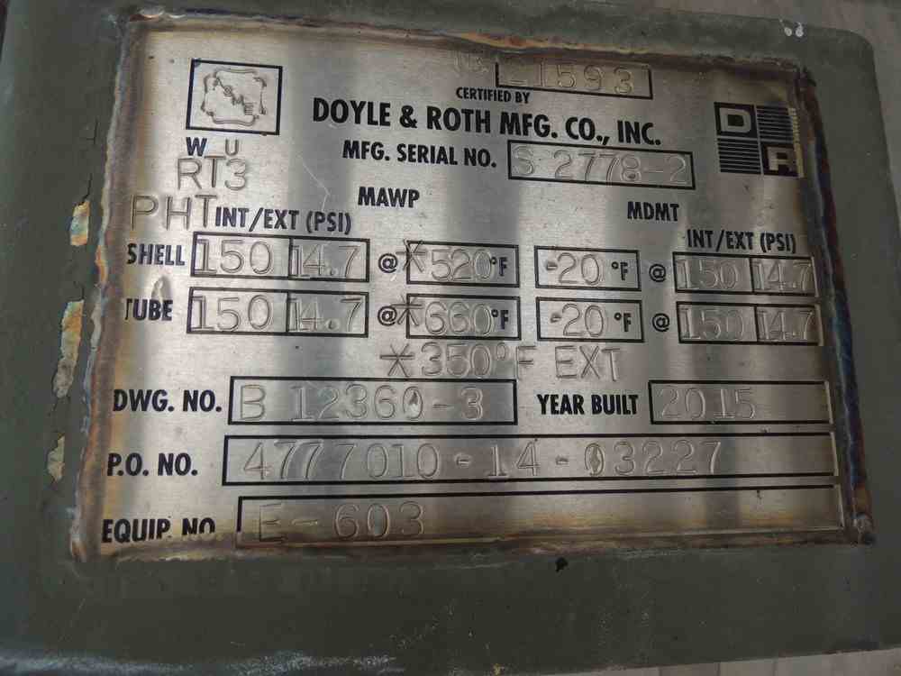 Used 149 Sq Ft Doyle and Roth Carbon Steel Shell and Tube Heat Exchanger. Shell rated 150PSI/FV @ 520 F. (90) .75"OS x 8'L tubes rated 150PSI/FV@660F. Serial #S2778-2. National Board #21593. Built 2015.