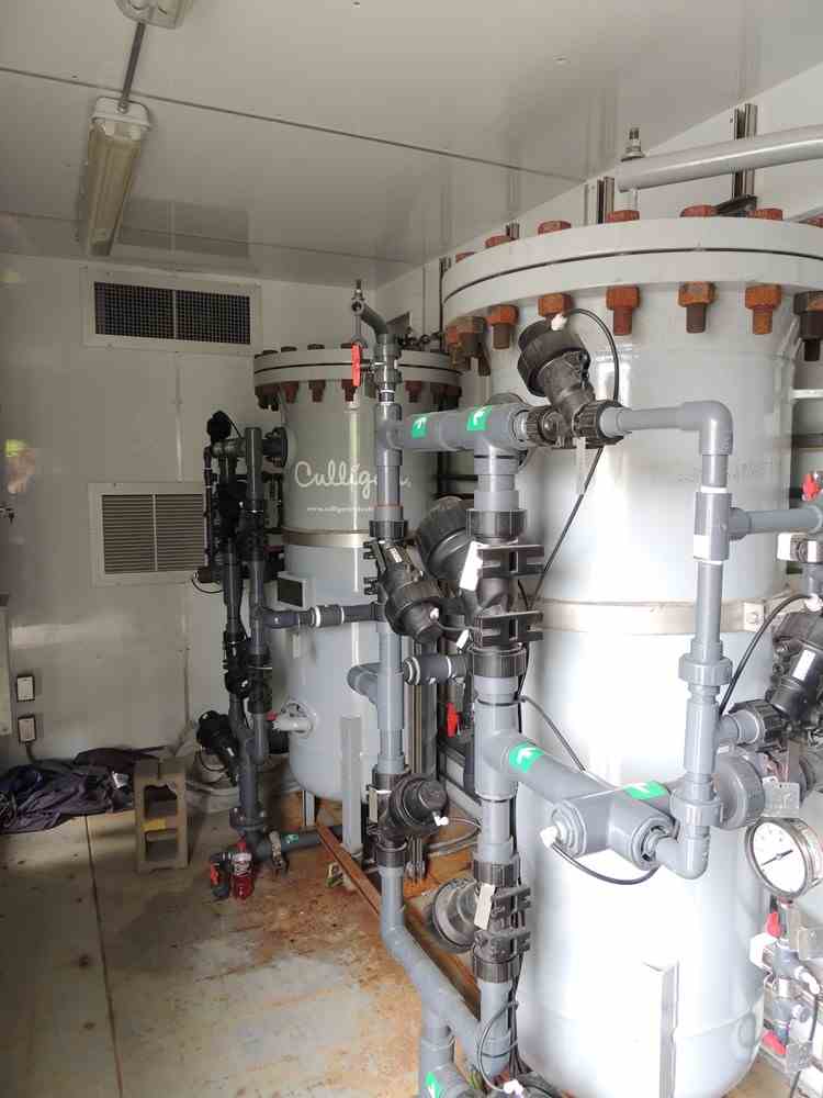 Used Culligan International Water Treatment Skid. Reverse Osmosis system. 14 GPM @100PSIG at outlet. Max Temp 100F. Model #RC0680-SP10426. In Shipping Container. Serial #NONU 504428-4. Weight 22250 lbs.