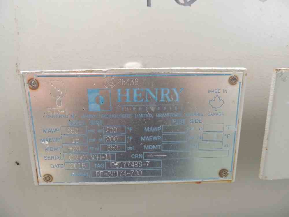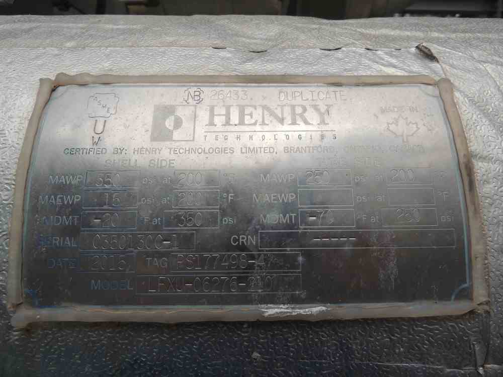 Used 97.8 Sq Ft Carbon Steel Shell and U-Tube Heat Exchanger. Mfg Henry Technologies. Shell Rated 350PSI/FV@200F. (13) U-tubes .625" x 555.5"OAL rated 250PSI@200F. Serial #C350130C-1. National Board #26433 (Dup). Built 2015.