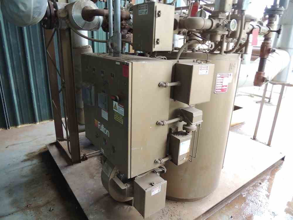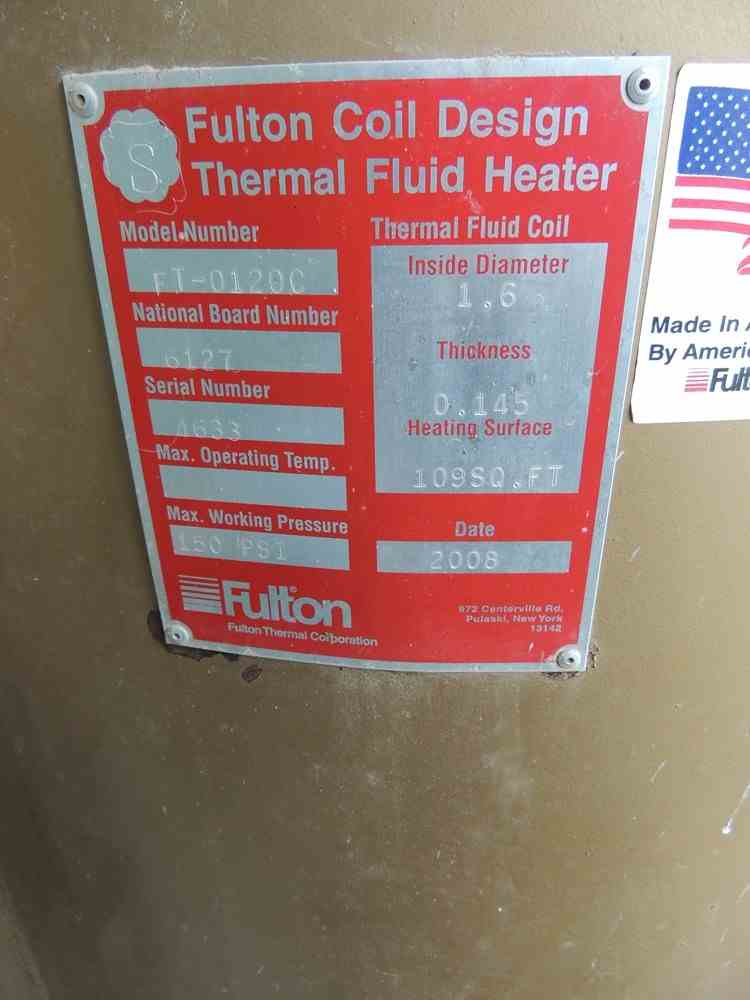 Used Fulton Thermal Oil Heater Skid. Model FT-0120C. MAWP 150 PSI. 40HP Pump. Control Panel. Serial #4633. National Board #6127. Built 2008.