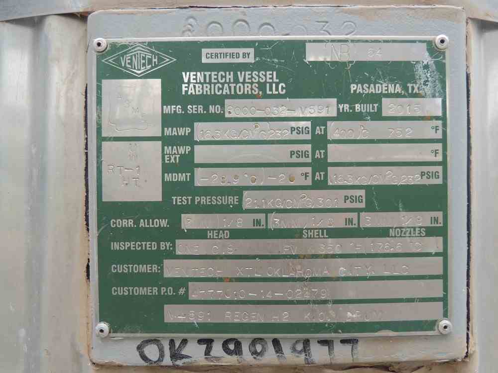 Used 225 GAL Ventech Carbon Steel Tank. Rated 232 psig @ 752 F. Dished top and bottom. (4) Leg mounted. Estimated weight of 2,000 lbs. S/N 8000-032-V591, NB # 64. Built in 2015.