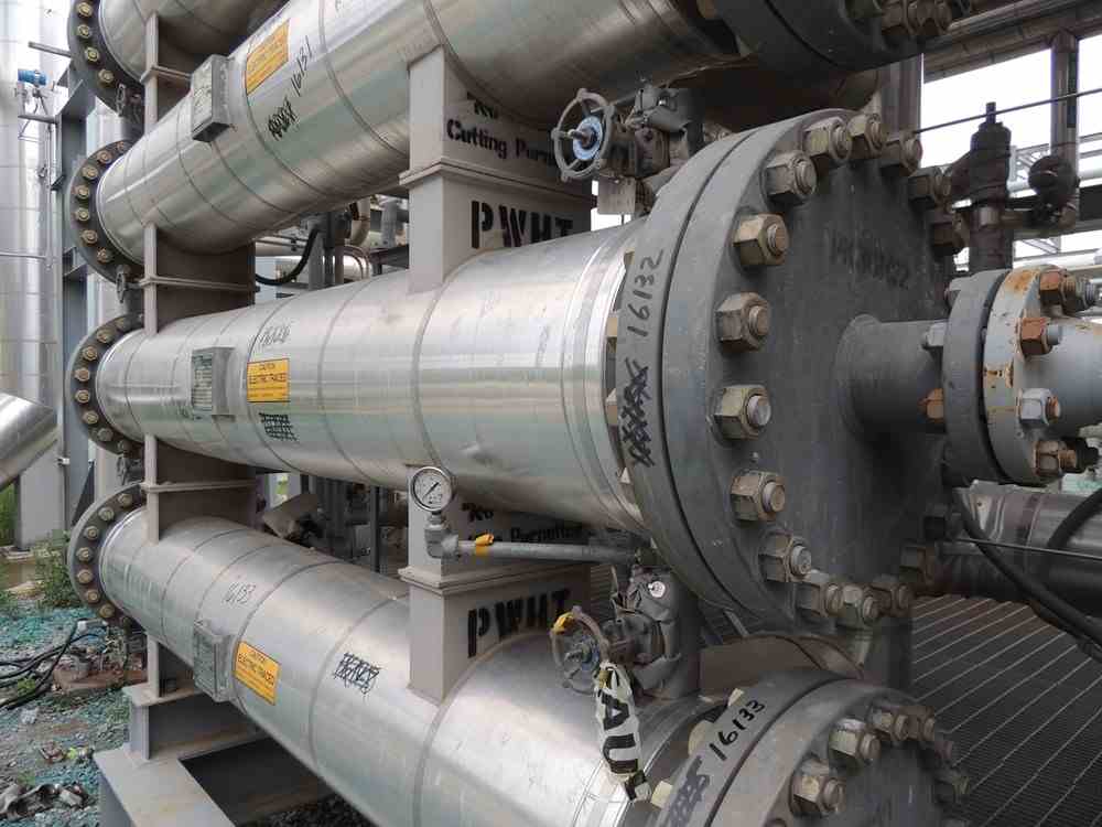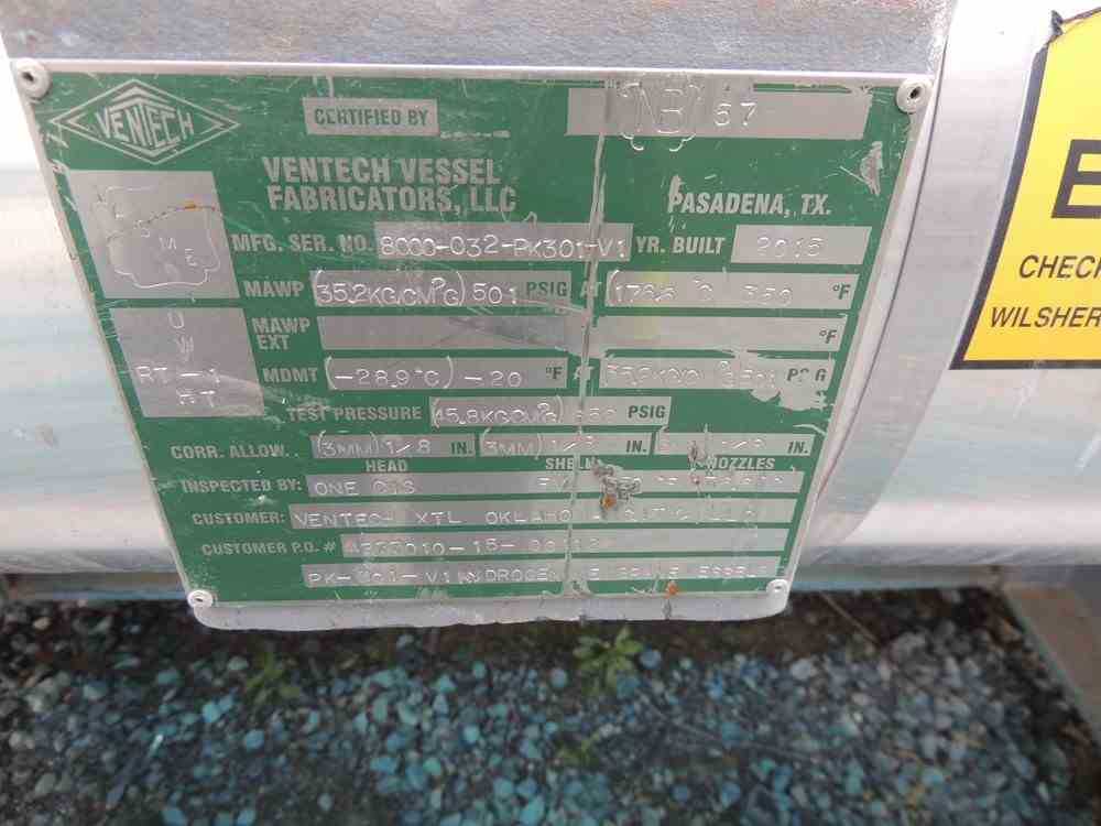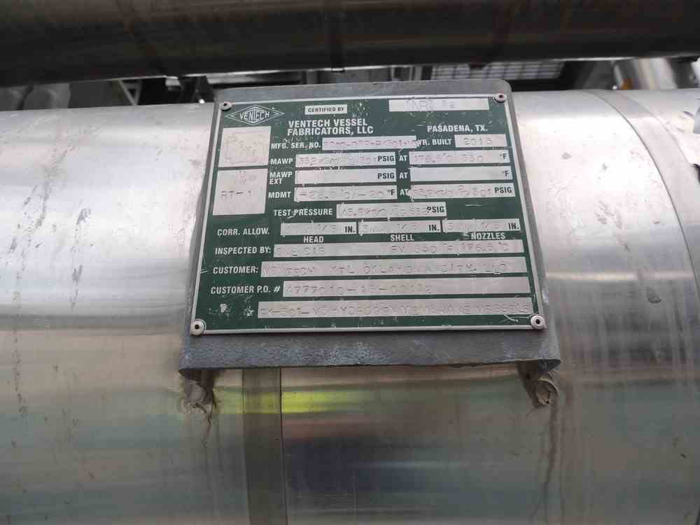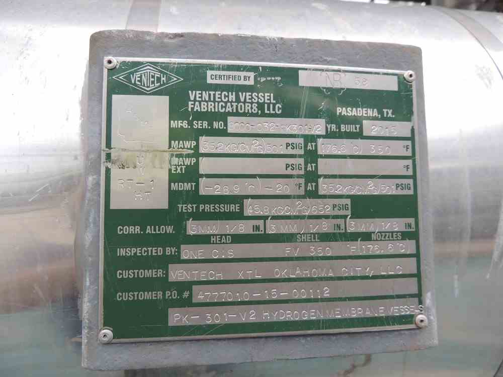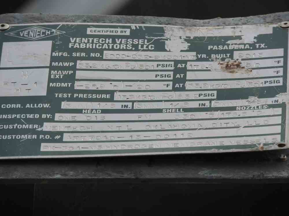Used 8,845 SCFM Hydrogen Membrane Package. Includes (5) Used Hydrogen Membrane Vessels. Mfg Ventech Vessel Fabricators. Rated MAWP 501PSIG/FV@350F. Saddle Mounted. Serial numbers D8000-032-PK301-V1 through V5. National Board #57 through 61. Built 2015.