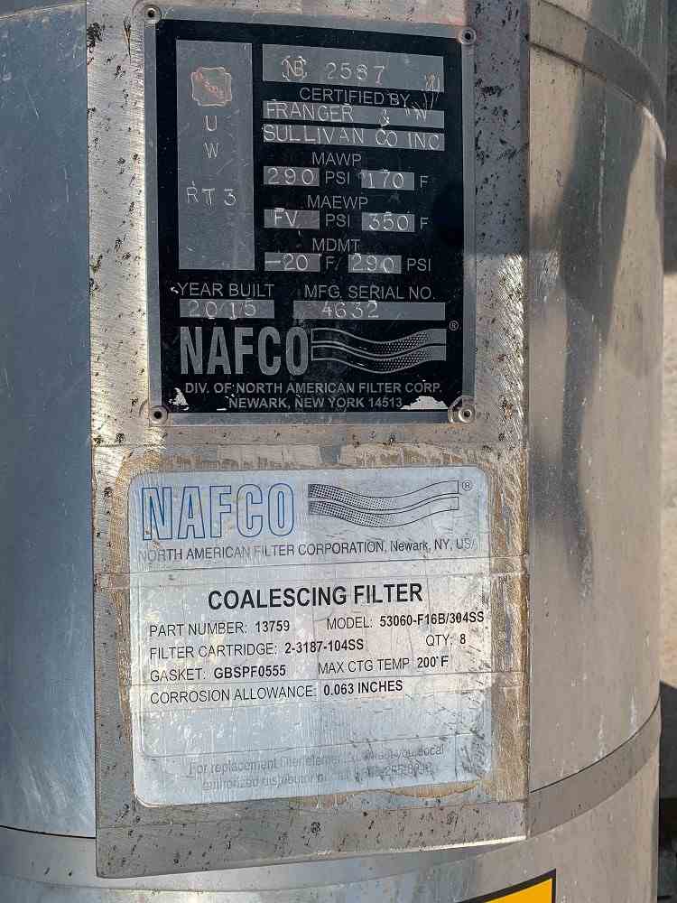 Used 18" Syngas SS Coalescing Filter . Mfg NAFCO. Model 53060-F-16B/304SS. Shell 225PSI@170F. (4) Leg mounted. Serial #4632. National Board #2587. Built 2015.