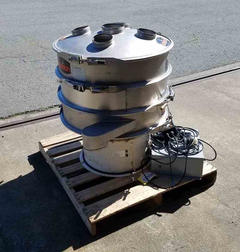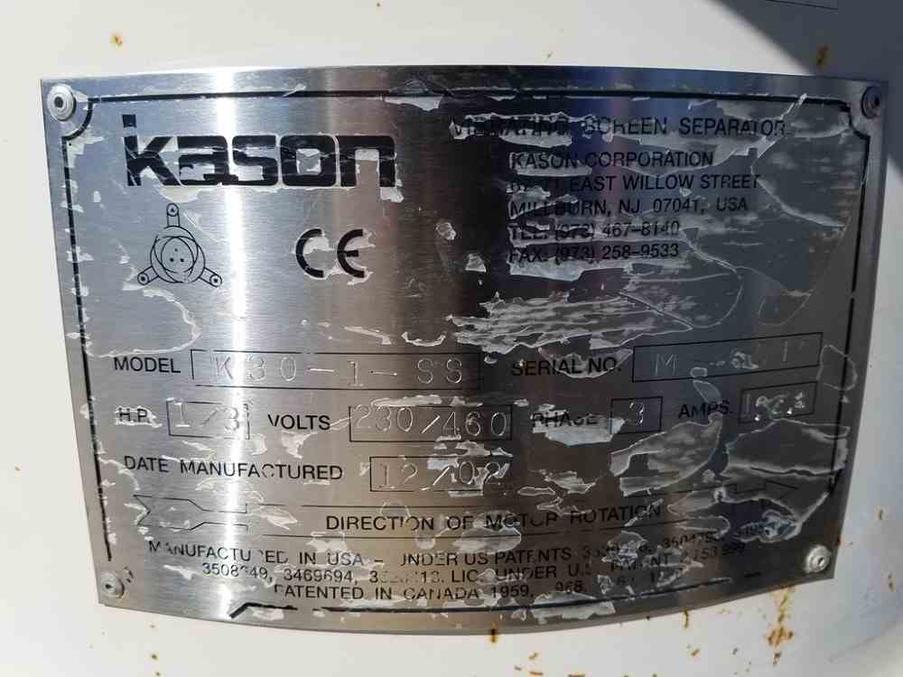 Used Screener, Kason Model K-30-1-SS, 30" diameter, set up as double-deck, all stainless steel contacts, 1/3 HP motor, 230-460 Volts, 3-phase, AMPS 16/8, manufactured in 2002. Unit includes Ultrasonic system to break up solids. Serial number M-6015.