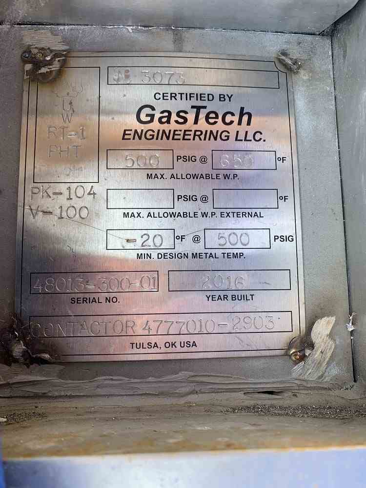 Used 1170 gallon SS Pressure Vessel. Mfg GasTech Engineering LLC. MAWP 500PSI@650F. 10'H x 4'2" Dia. Dished Top and Bottom. (4) Leg Mounted. Serial Number 48013-300-01. National Board #3073. Built 2016.