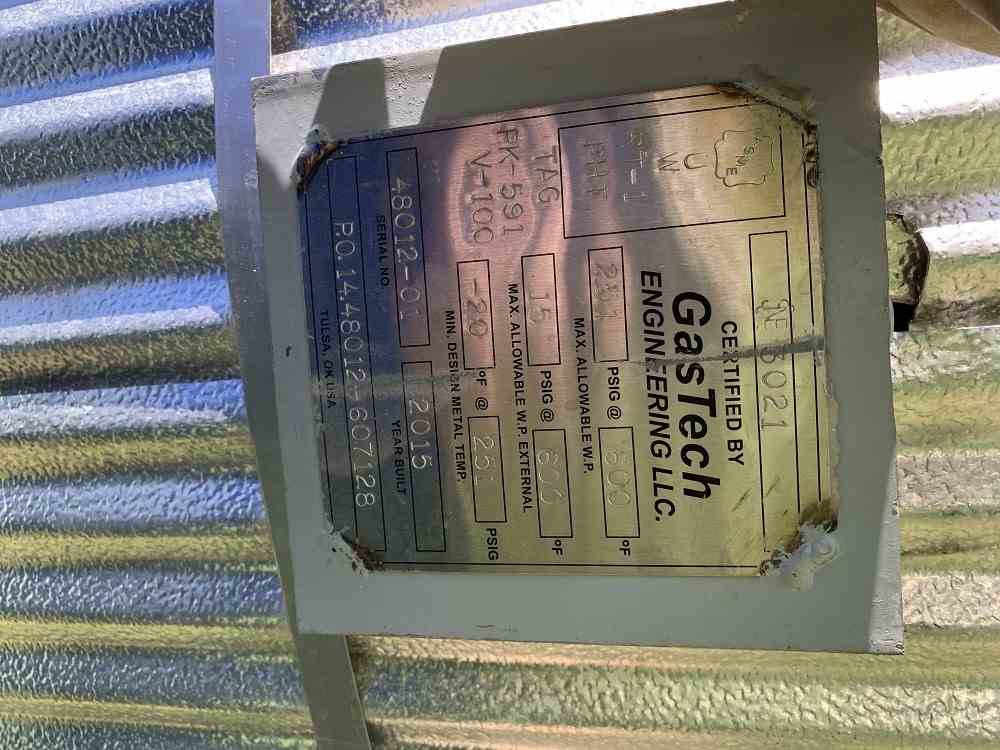 Used 1661 Gallon CS Vertical Pressure Vessel. Mfg GasTech Engineering LLC. MAWP 251 psig@600 F. 4'0" dia x 16'0" T/T. Dished top and bottom. (4) Leg mounted. Estimated weight of 18,000 lbs. Serial #48012-01. National Board #3021. Built 2015.