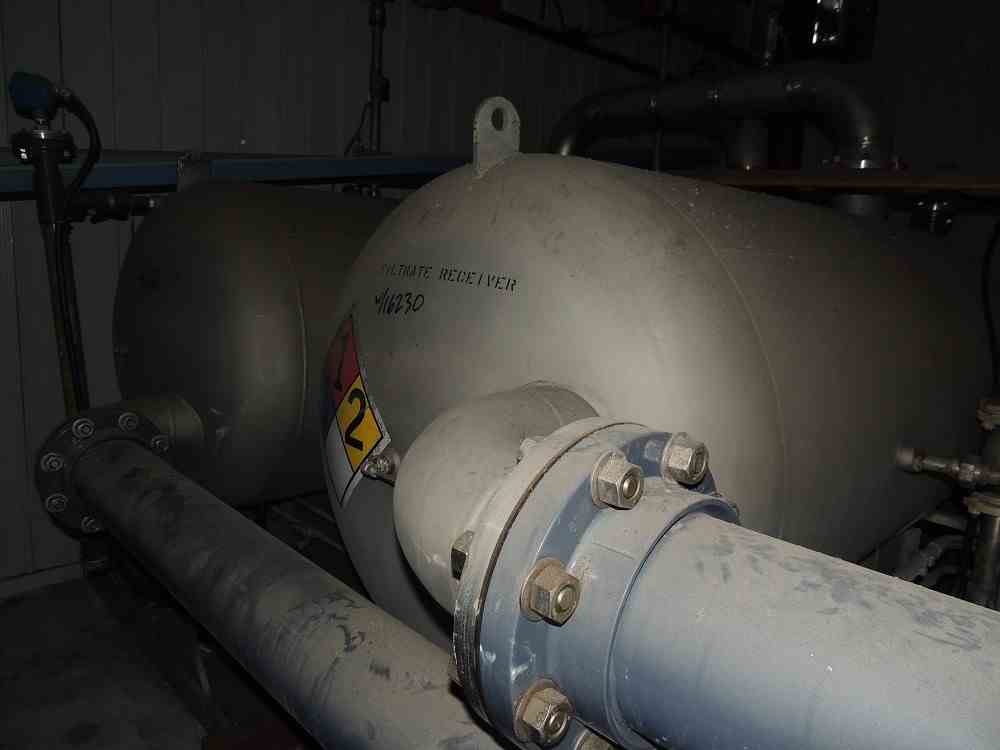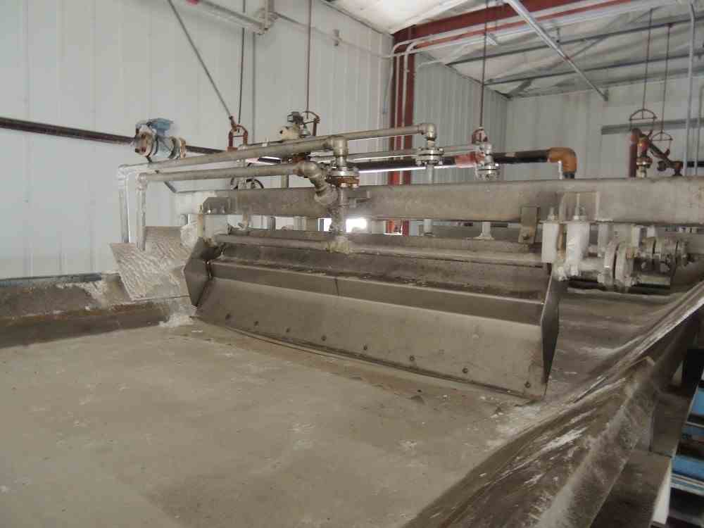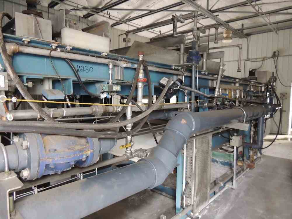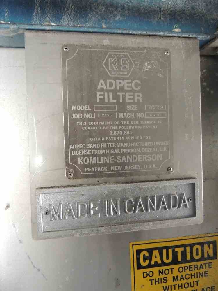 Used 53.8 Sq. Ft. Komline Sanderson Horizontal Vacuum Belt Filter. Model K-S ADPEC. Size 1.25 x 4. Discharge- Scraper. 53.8 square feet effective filtration area; 1.25m x 4m (nominal). Includes Vacuum Pump skid with Separator tank, (2) receiver tanks with filtrate pumps. Overall Dimensions: Approximately 35'9"' OAL x 6'10" width x 7'2" height. Approximately 14300 lbs. Serial #AD 98. Built 1996.