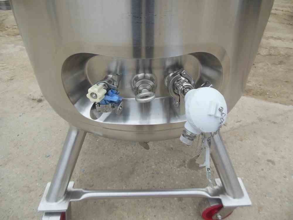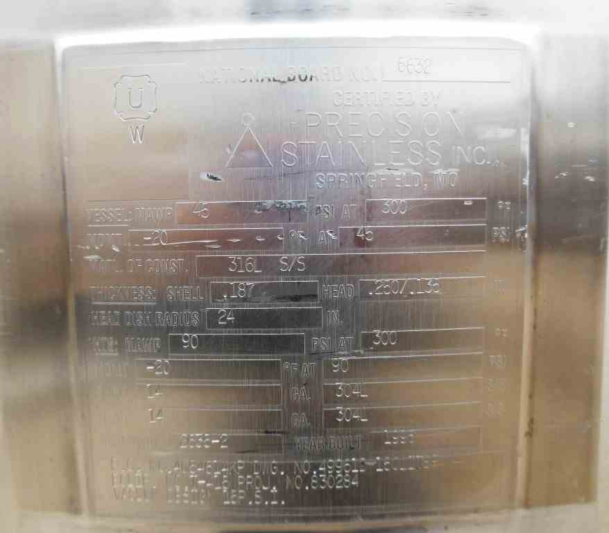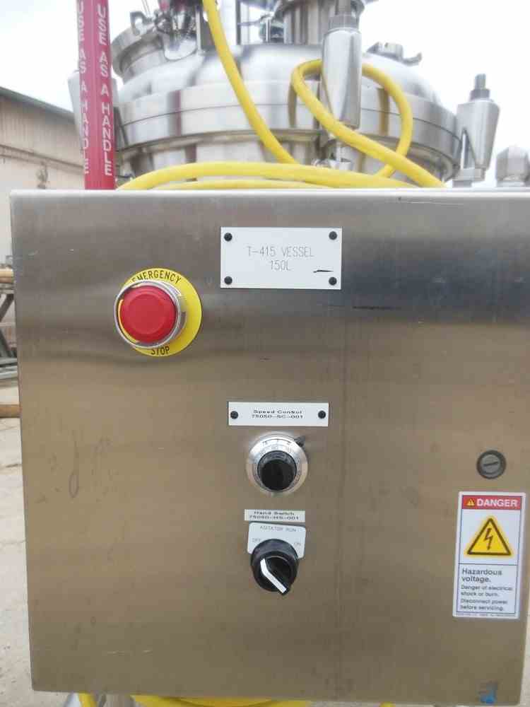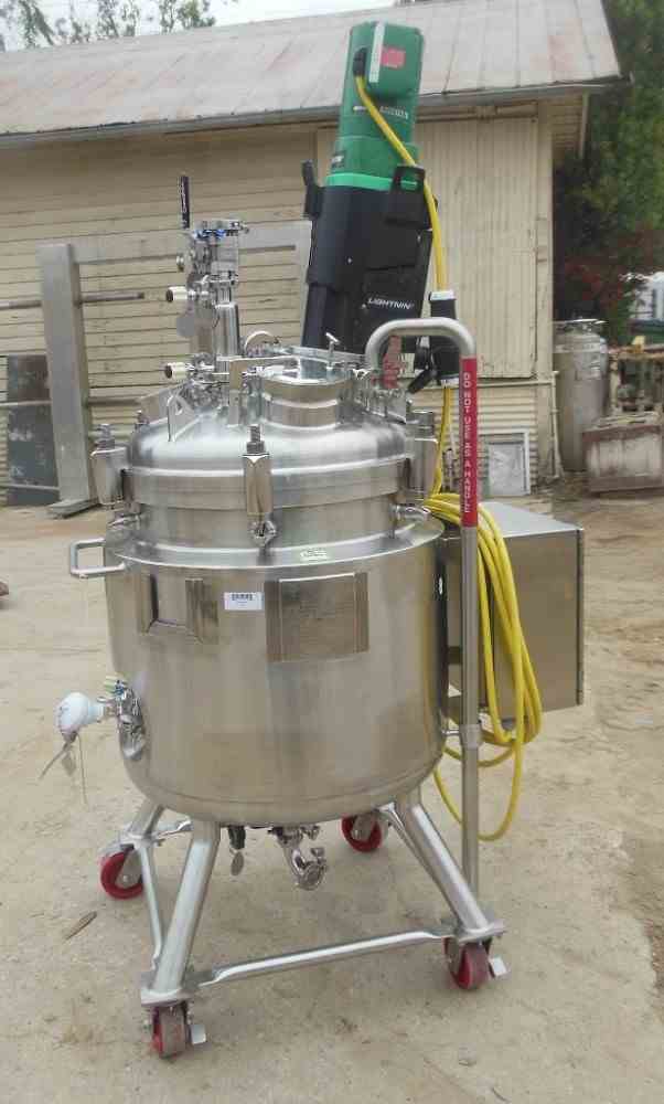 Precision Stainless 150 Liters (approximately 40 gallon) 316L stainless steel reactor. Unit measures 24" diameter X 2" straight side with dish top and bottom and 1-1/2" center bottom discharge. MAWP of 45 psi @ 300 deg. F., jacket rated for 90 psi @ 300 deg F. Includes Lightnin Vektor 271607 agitator driven by 1/2 HP, 230/460V motor. Includes ES&B GFR-SE Rupture Disk. Includes internal spray ball. Unit new in 1996, Nat. Board # 6632. Portable on casters. Very good condition.