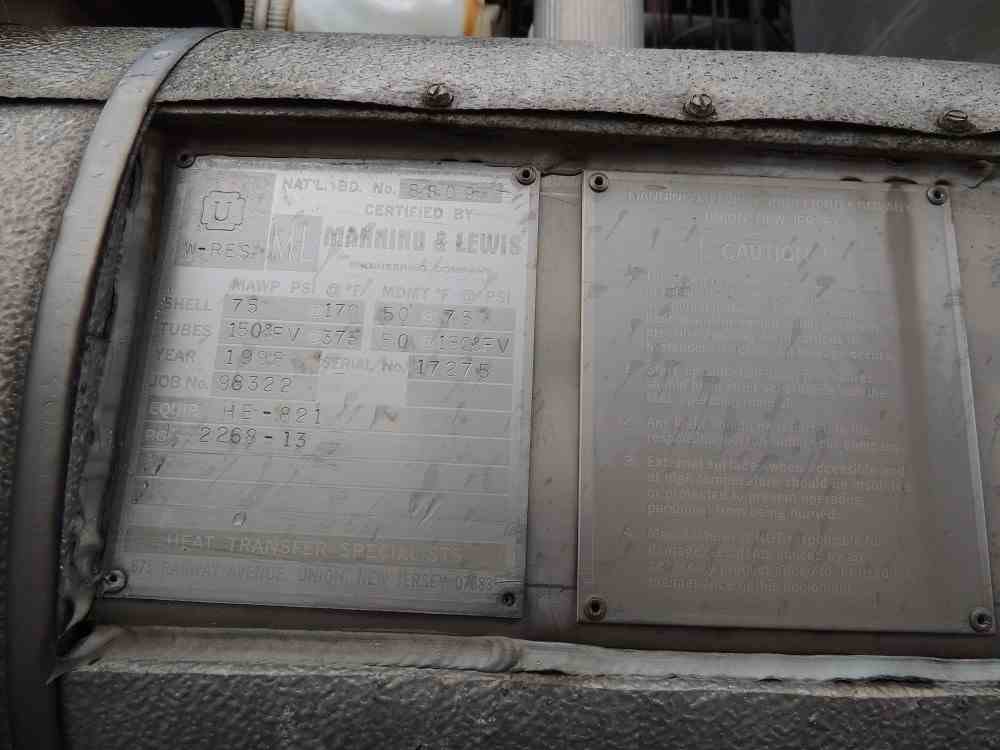 Used 28 Sq ft Horizontal 316L SS Shell and Tube Heat Exchanger. Mfg Manning and Lewis. Shell MAWP 75PSI@170F. Tubes MAWP 150PSI/FV@375F. Serial #17275. National Board #8809. Built 1998.