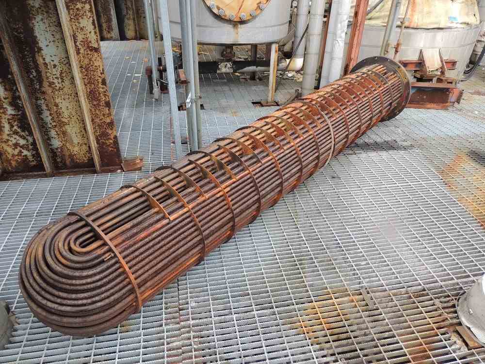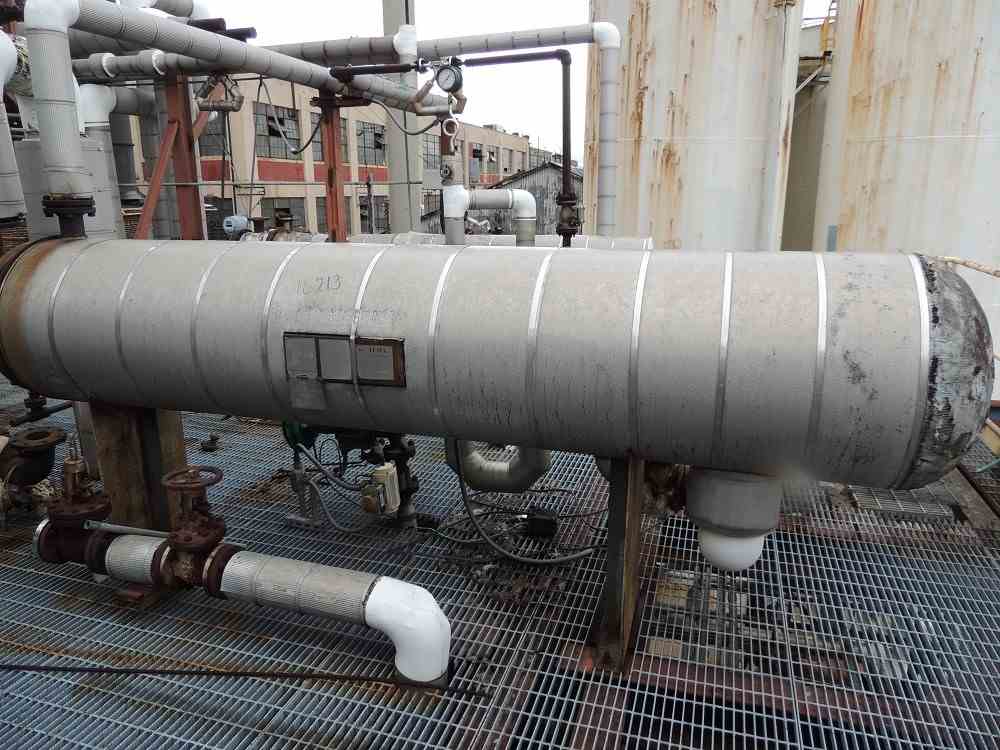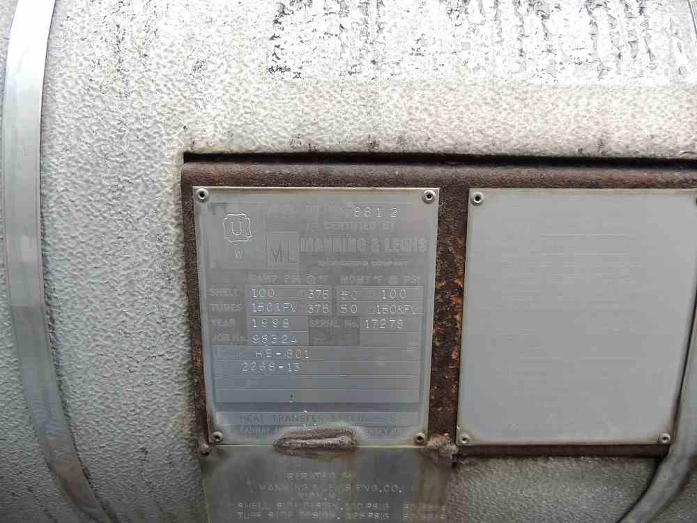 Used approx 570 Sq Ft Carbon Steel Horizontal Shell and Tube Heat Exchanger. Mfg Manning and Lewis. Shell MAWP 100PSI@375F. Tubes MAWP 150PSI/FV@375F. Serial #17278. National Board #8812. Built 1998. Rerated Shell 100 PSIG 50/650F. Tubes 125PSIG 50/650F. 2001.