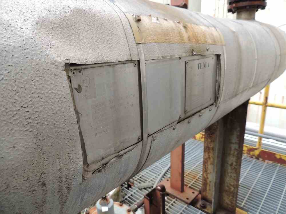 Used approx 50 Sq ft SS Horizontal Shell and Tube Heat Exchanger. CS Shell MAWP 15PSI/fv@300F. 316 SS Tubes MAWP 125PSI@300F. Serial #17281. National Board #8815. Built 1998.