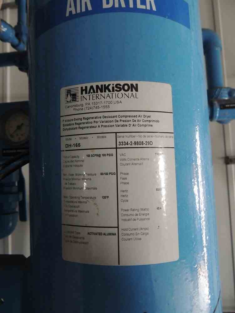 Used 165 SCFM Air Dryer. Mfg Hankinson Intl. Model DH-165. 165 SCFM@100PSIG. Serial #3334-2-9809-29D.