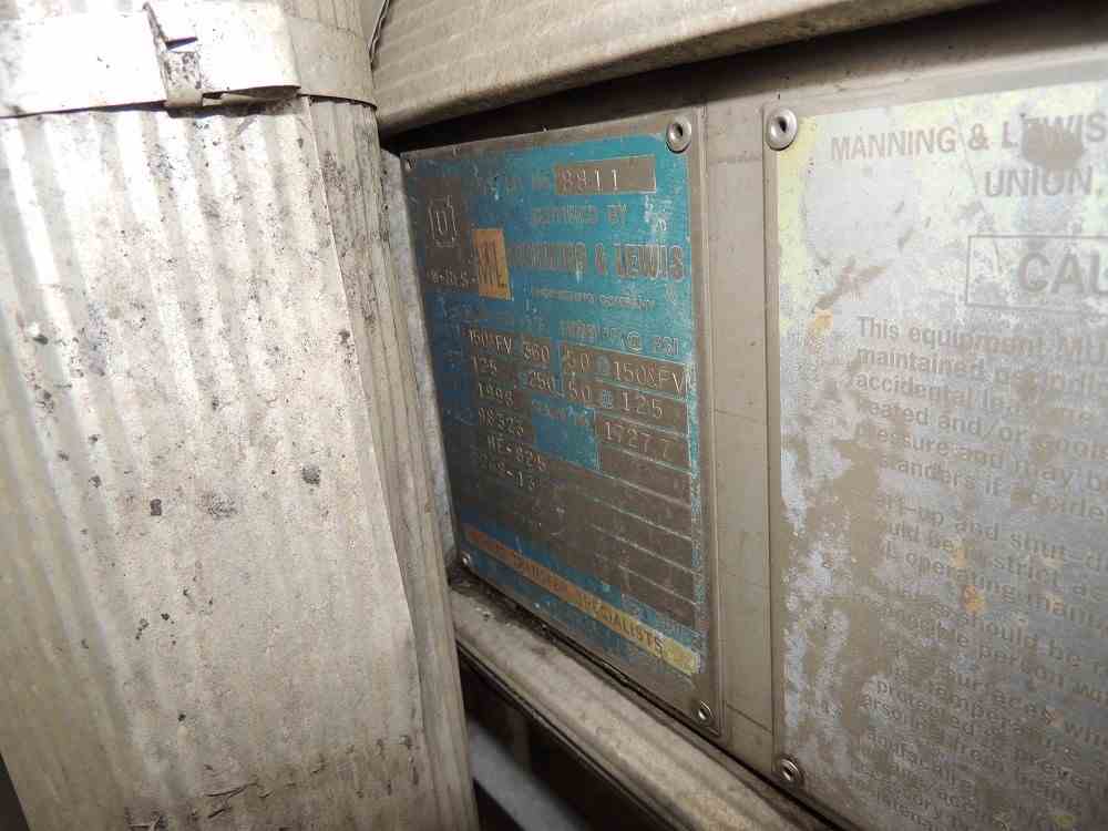 Used Approx 80 Sq ft 316L Stainless Steel Horizontal Shell and Tube Heat Exchanger. Mfg Manning and Lewis. Shell MAWP 150/FV@360F. Tubes 125PSI@250F. Serial #17277. National Board #8811. Built 1998.