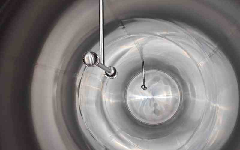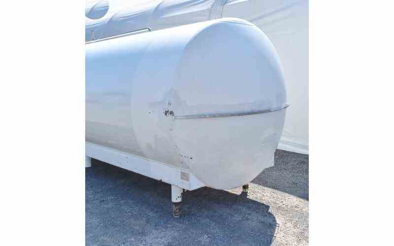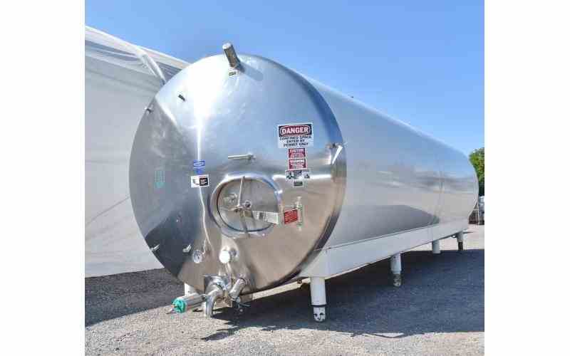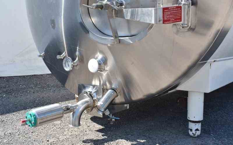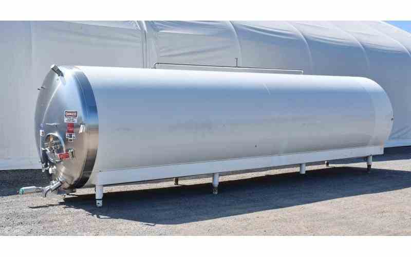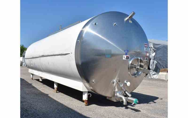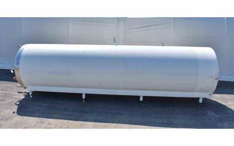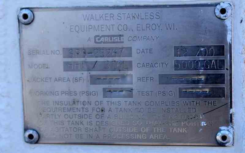USED 5000 GALLON HORIZONTAL TANK, 316L STAINLESS STEEL, INSULATED, SANITARY. INTERIOR DIMENSIONS: 6' DIAMETER X 25' LONG. OVERALL HEIGHT: 7'. INLET: 3". DISCHARGE: 5". PORTS: 3", 1.5". MANWAY WITH COVER: 20" X 16". WITH FOUR (4) SPRAY BALLS. ON EIGHT (8) LEGS. MANUFACTURER: WALKER, MODEL: HHT 316L, BUILT 2000.